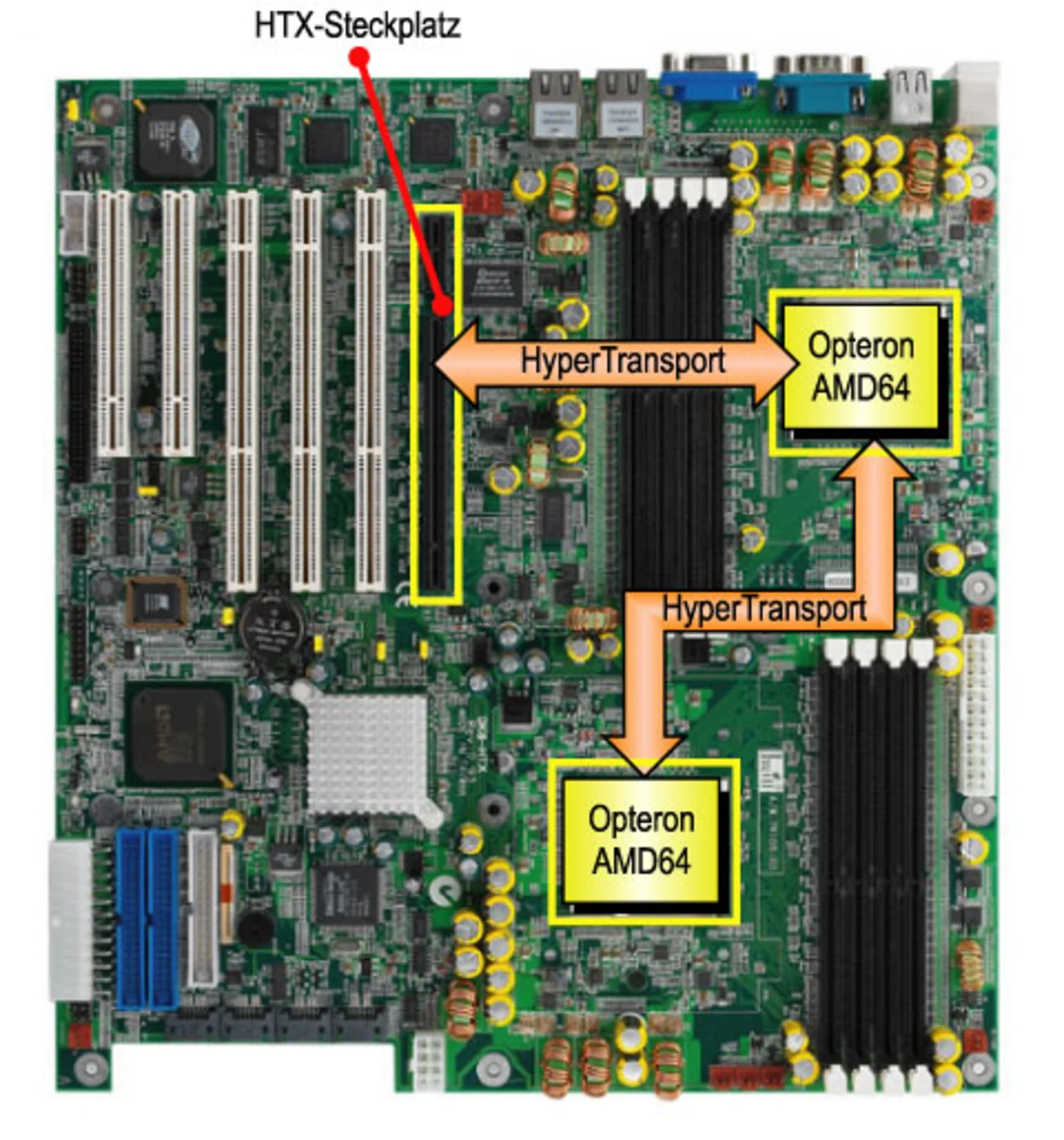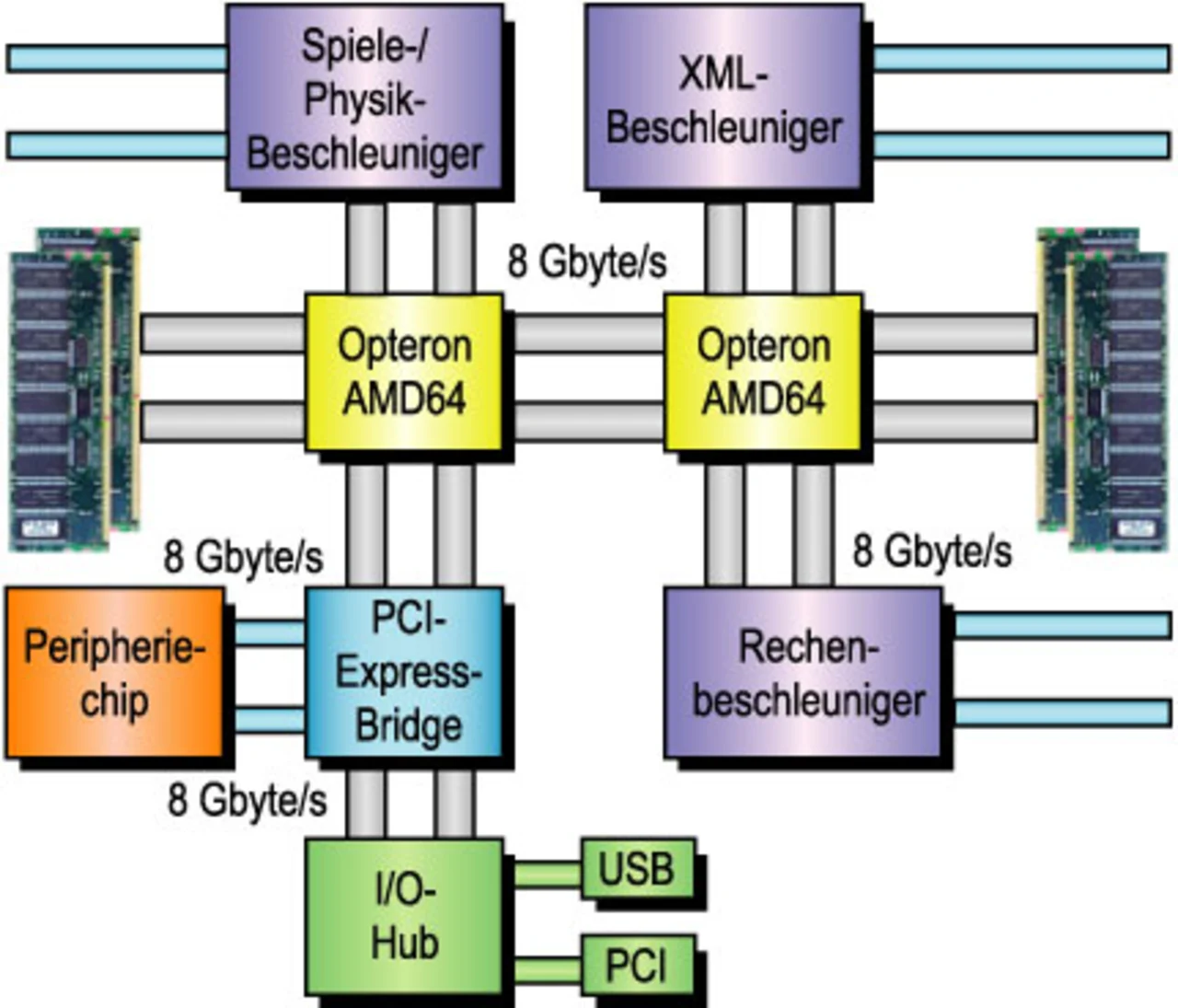 Wesentliche Merkmale der AMD64-Systemarchitektur sind der in den Prozessor integrierte Memory Controller und das HyperTransport-Interface für die Chip-to-Chip-Verbindung. Letzteres erlaubt die direkte Verbindung von CPUs in Multiprozessorsystemen sowie die direkte Anbindung von Peripherie-Schaltkreisen wie I/O-Hubs oder Coprozessoren. HyperTransport ist skalierbar in Linkbreiten von 2 bis 32 bit und Frequenzen von 200 MHz bis 1,4 GHz und unter-stützt Datenraten bis 22,4 Gbyte/s. Jeder Opteron-Prozessor, der für Multiprozessor-Plattformen vorgesehen ist (Serien 200 und 800), verfügt über drei HyperTransport-Links. Je nach System-Konfiguration besteht die Möglichkeit, freie HyperTransport-Links für den Anschluss von Coprozessoren zu benutzen. Bild 1 zeigt eine mögliche Konfiguration.
