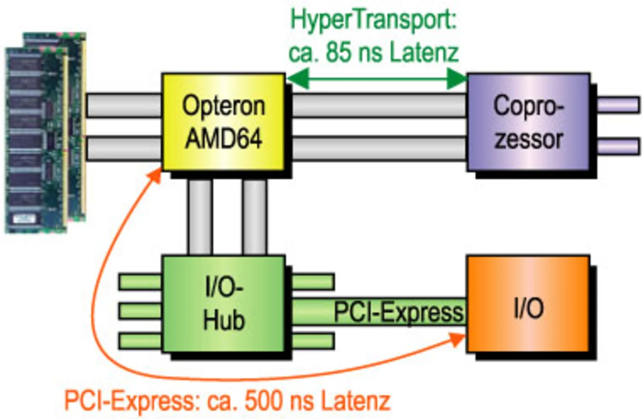 Die Latenz von Speicherzugriffen bei HyperTransport ist um 55 Prozent geringer als bei PCI-Express. Grund hierfür ist die direkte („glueless“) Verbindung des Coprozessors zur CPU, während in herkömmlichen Systemen die PCI-Express-Devices nur über den I/O-Hub erreichbar sind. Weiterhin zeichnet sich HyperTransport durch ein effektives Protokoll aus. Der maximale Overhead pro HyperTransport-Da-tenpaket beträgt 12 Bytes gegenüber 24 Bytes bei PCI-Express. Durch so genanntes „Priority Request Interleaving“ können Lese-Zugriffe in den laufenden Datentransfer eingeschoben werden, was zu geringerer Speicher-Latenz führt (Bild 2).