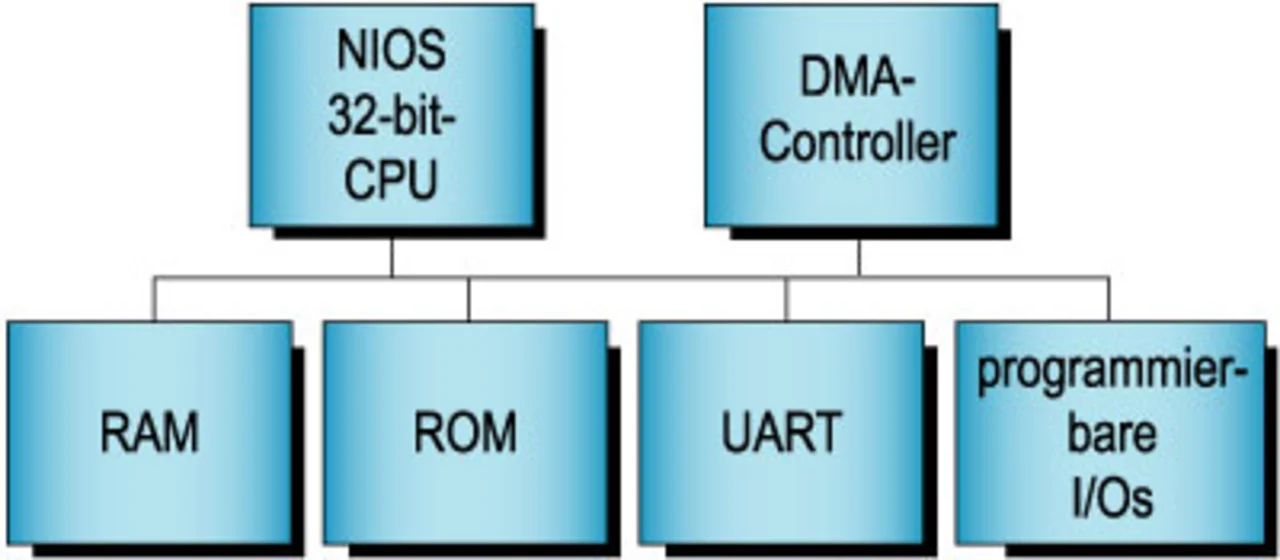 Das folgende Beispiel mit einem Stratix-II-Baustein zeigt, wie ein SOPC leicht und effizient implementiert werden kann. Das hier ausgewählte Design ist ein I/O-Subsystem, das aus einem 32-bit-Nios-Embedded-Prozessor zur Steuerung einiger paralleler I/Os, einem UART für die Kommunikation und On-Chip-RAM und -ROM besteht. Um die verfügbare CPU-Bandbreite zu maximieren, wurde noch ein DMA-Controller hinzugefügt, der den Datentransfer zwischen UART und Speicher ohne Belastung der CPU ausführt. In diesem relativ einfachen Subsystem gibt es insgesamt sechs Blöcke, die über einen gemeinsamen Bus verbunden sind (Bild 1).