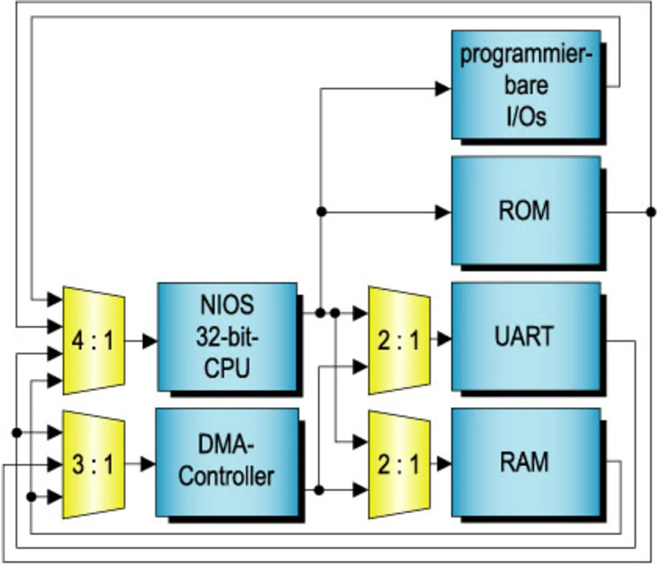 In diesem Beispiel brauchen die zwei Bus-Master Bus-Multiplexer, um einen Eingangs-Bus für jeden Slave zu unterstützen. Außerdem sind weitere Multiplexer erforderlich, damit mehrere Master auf den gleichen Slave zugreifen können. Weil in diesem Beispiel ein 32-bit-Datenbus genutzt wird, braucht der Eingang des Lese-Ports der CPU alleine 32 4:1-Multiplexer. Da die Komplexität von SOPC-Systemen steigt und weitere Bus-Master hinzukommen, werden breitere und zusätzliche Multiplexer notwendig.