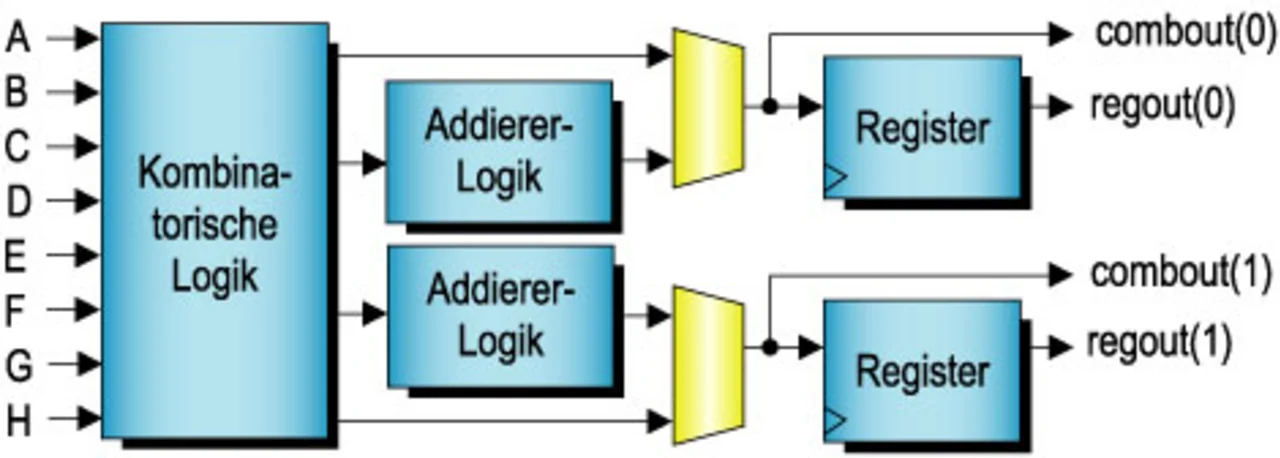 Die flexible neue Stratix-II-Logikstruktur ist um die ALMs herum aufgebaut. Ein ALM hat acht Eingänge, zwei Ausgänge und zwei Register, die unabhängig voneinander oder in Verbindung mit LUT-Ressourcen (Look-up-Tables) genutzt werden können (Bild 3). Außerdem sind Pfade für Übertrag, Kaskadierung und Rückkopplung vorhanden, mit denen sich komplexere Funktionen aufbauen lassen oder dedizierte Addierer für die Unterstützung eines Dreifach-Addierbaums realisieren lassen.