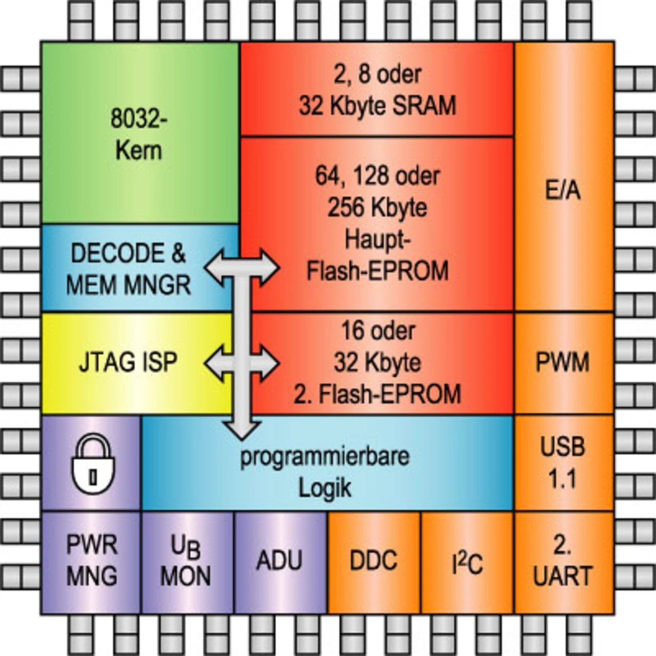 Der für das Kryptosystem eingesetzte Mikrocontroller uPSD3234 von STMicroelectronics weist integrale Eigenschaften auf, die sich für den Aufbau eines kleinen, geschlossenen Kryptosystems besonders gut eignen (Bild 1). Die uPSD-Architektur umfasst einen 8032 Mikrocontrollerkern mit einer Reihe von Zusatzfunktionen wie Analog/Digital-Umsetzer (ADU) und Pulsweiten-Modulator (PWM) sowie eine Reihe von Standard-E/A-Schnittstellen – USB (Universal Serial Bus), UART (Universal Asynchronous Receiver Transmitter), I2C (Inter IC Communication). Außerdem verfügt der Mikrocontroller über einen großen Programmspeicher von maximal 256 Kbyte Flash-EPROM, der problemlos neben einer Applikations-Software auch die Verschlüsselungs-Software aufnehmen kann. Eine Besonderheit dieses Mikrocontrollers ist die Fähigkeit zu In-Application-Programming (IAP). Damit lassen sich Konfigurationseinstellungen, Teile des Schlüssels oder ganze Programmteile während des Programmlaufs verändern und gleichzeitig dauerhaft speichern.