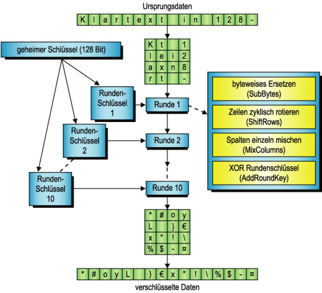 Die Klartextinformationen werden bei der Verschlüsselung unkenntlich gemacht und alle in der Kryptoanalyse verwertbaren statistischen Strukturinformationen auf ein Minimum reduziert. Die statistische Unabhängigkeit der Geheimtextdaten von Schlüssel- bzw. Klartextinformationen soll idealerweise soweit gehen, dass die Änderung eines einzelnen Bits, in einem Klartextblock oder auch im Schlüssel, im Mittel zu einer Änderung der Hälfte aller Bits im verschlüsselten Datenblock führt. Diese Vorgabe erfüllt der AES-Rijndael mit steigender Rundenzahl immer besser [8].