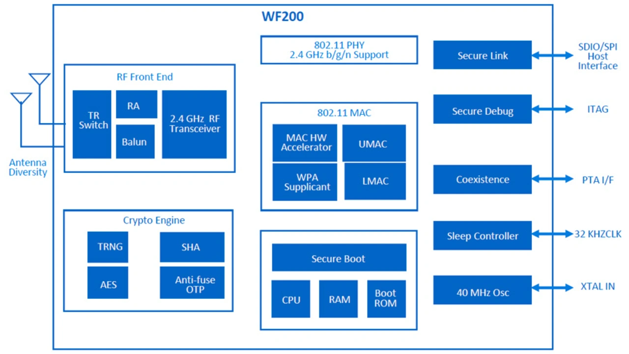 Die HF-Stufe des WLAN-Transceiver-ICs WF200 ist für den Diversity-Betrieb mit zwei Antennen ausgelegt – mit Umschaltern und Balun. Damit soll eine robuste Funkübertragung auch dann möglich sein, wenn das 2,4-GHz-Band von vielen Funk-Transceivern für die Datenübertragung genutzt wird.