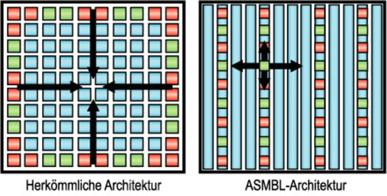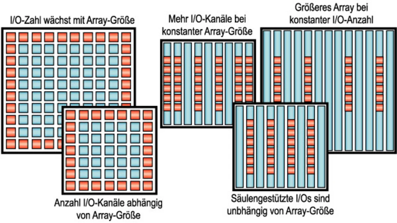 Die Gehäuse-bedingte Anordnung der I/O-Blöcke am Rand des Die sorgt für große Leitungslängen, weil alle Verbindungen von den Funktionsblöcken im Die-Inneren zum Außenrand des Chips geroutet werden müssen (Bild 2, links). Mit zunehmender Miniaturisierung wächst der Leitungswiderstand pro Längeneinheit, was eine Zunahme des Spannungsabfalls auf den Leitungen verursacht. So entsteht Verlustleistung auf den Versorgungsleitungen, und die Funktionsblöcke erhalten eine niedrigere Versorgungsspannung. Längere Verbindungen (Interconnects) beeinflussen nicht nur die Stromversorgung, sie beeinträchtigen auch die Signalqualität. Niedrigere Taktfrequenzen und auch eine geringere erreichbare Daten-Bandbreite waren die Folge.