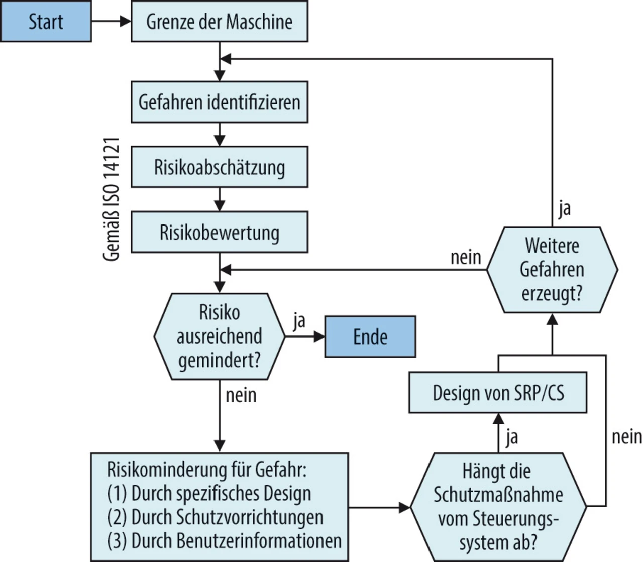 Die Norm ISO 13849 stellt eine anwendbare Systematik für die Entwicklung und Bewertung von Maschinensteuerungen zur Verfügung. Zentraler Bestandteil dieser Systematik ist der Gesamtablauf zur Risikominderung, der in Bild 1 dargestellt ist.