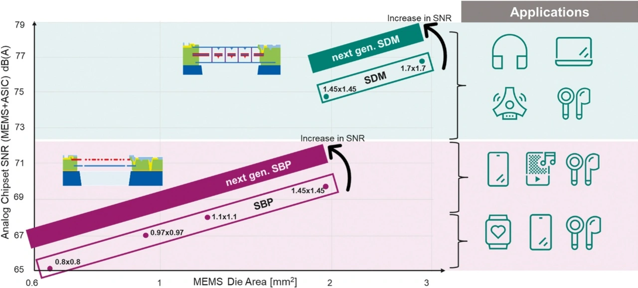 Den Vorteil der besseren Leistungsfähigkeit muss die SDM-Technik allerdings durch einen komplexeren Aufbau bezahlen: Um die beiden Membranen und die weiteren erforderlichen Elemente fertigen zu können, müssen gegenüber den SBP-Mikrofonen mehr Schichten abgeschieden werden, was deutlich mehr Prozessschritte erfordert. Das macht sie teurer.