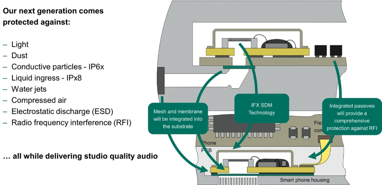Doch es gibt einen noch wichtigeren Beweggrund: »Die Innovationen finden inzwischen zu einem nicht unerheblichen Teil in der Verbesserung der Gehäusetechnik statt«, erklärt Füldner und spricht bereits von der nächsten Revolution: Mithilfe der neusten Xensiv-Technologie kann die Membran zum Schutz der Mikrofone bereits im Gehäuse integriert werden.