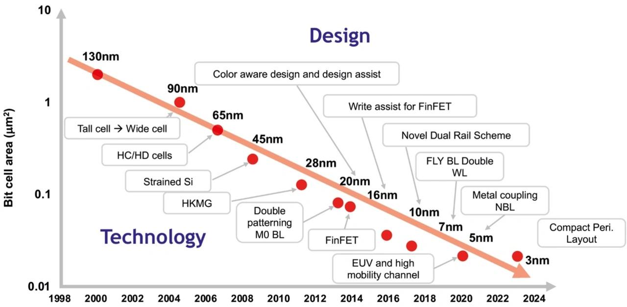Auch wenn die Halbleiterindustrie in der Lage ist, die Skalierung munter weiter voranzutreiben, darf nicht vergessen werden, dass der Aufwand immer größer und kostspieliger wird. Deshalb ist Zhang überzeugt, dass ein DTCO-Ansatz (Design-Technology-Co-Optimization) unabdingbar ist; Designer und Technologieentwickler müssten zusammenarbeiten, um auf Produktebene das Maximum zu erreichen – DTCO ist ein Schlüssel zum Erfolg. Als Beispiel verweist er auf die sogenannte Fin-Depopulation, sprich: die Anzahl der Finnen pro Transistor zu reduzieren, wodurch die Höhe der Standard-Logikzellen und die Leistungsaufnahme sinken – problematisch dabei ist nur, dass damit auch Geschwindigkeit verlorengeht. Also haben sich die Technologieentwickler und Designer zusammengesetzt und einen neuen Ansatz entwickelt, den Zhang »FinFlex« nennt. Damit können Designer Transistoren mit 1 Finne oder 2 Finnen oder 2 Finnen und 3 Finnen mischen, um so auf Produktebene die optimale Geschwindigkeit, optimale Dichte und optimale Leistungsaufnahmen zu erreichen. Eine SRAM-Bitzelle ist für ihn ein weiteres Beispiel, das zeigt, was mit DTCO erreicht werden konnte. 2000 lag die Prozessgeometrie bei 130 nm, in diesem Jahr kommt eine 3-nm-Technologie zum Einsatz, »sodass wir eine Verbesserung der Dichte um einen Faktor von 100 realisieren konnten«, so Zhang. Hierfür sind natürlich einerseits die Verringerungen der Prozessstrukturen verantwortlich, aber eben nicht nur, sondern auch neue Design-Ansätze wie beispielsweise die NBL-Schreib-Assist-Technik, mit der sich die minimale Betriebsspannung (VMin) reduzieren lässt, »und das um über 300 mV für HD-SRAM«, so Zhang weiter. Für diese Fortschritte sind also »Technologieentwickler und Designer gleich wichtig«, betont Zhang.