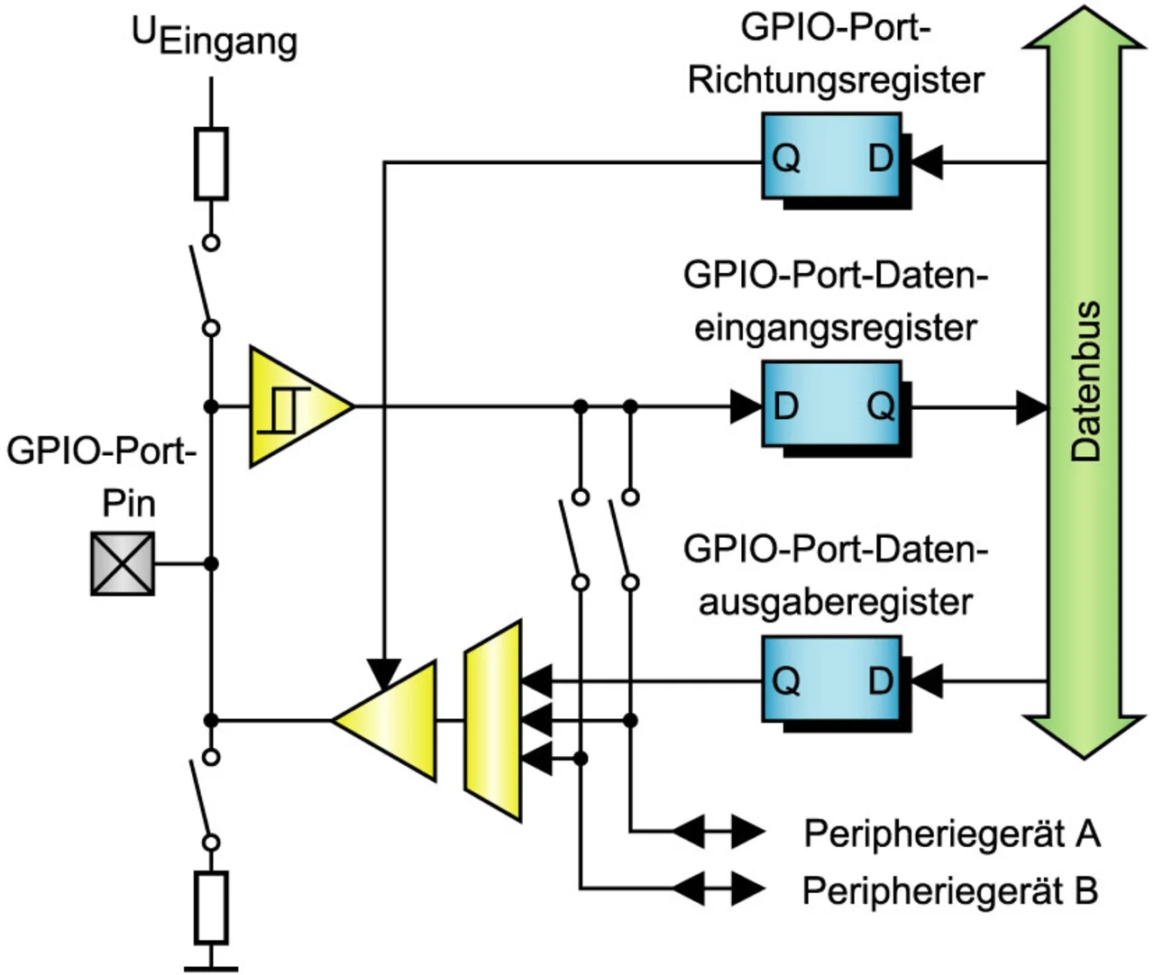 Ein typisches GPIO-Interface ist in der Lage, nicht nur jeden einzelnen Port-Pin in den High- bzw. Low-Zustand zu versetzen, sondern auch Pins in einen hochohmigen Modus zu schalten, so dass jeder damit verbundene Knoten nur eine geringe Last „sieht“. Dadurch ist es der analogen Schaltung einerseits möglich, wie üblich zu arbeiten, andererseits lässt sich bei Bedarf ein erwünschter Zustand einstellen: Beispiele dafür sind ein definierter Anfangszustand nach dem Einschalten (Power-up) oder das Anlegen bestimmter Signale beim Selbsttest-Modus.