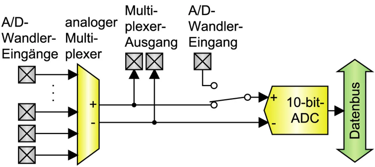 Die A/D-Wandler-Eingänge lassen sich als Single-ended- oder differenzielle Kanäle konfigurieren. Dabei bestimmt ein analoger Multiplexer, welcher Kanal an einen 10-bit-/ 10-µs-A/D-Wandler angeschlossen wird. Der Multiplexer-Ausgang (MUXOUT) und ein wählbarer A/D-Wandler-Eingang (ADCIN) sind an Pins herausgeführt, sodass ein externes Filter in den Front-End-Signalkonditionierungspfad eingefügt werden kann.