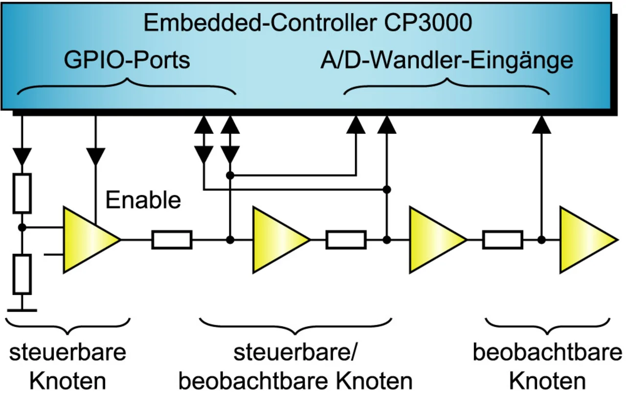 Die Steuerung von Knoten über GPIO-Ports ermöglicht die Implementierung von Low-Power-Modi. So können beispielsweise unbenutzte Widerstandsnetzwerke stromfrei geschaltet oder ganze Funktionsblöcke wie z.B. Verstärker (über Power-Control-Eingänge) abgeschaltet werden. Über GPIO-gesteuerte Knoten können auch Test- und Kalibrierungs-Modi implementiert werden. A/D-Wandler-Eingänge werden bei Knoten verwendet, die als analoge Signale lesbar sein müssen. Knoten, die zugleich überwachbar und steuerbar sein müssen, werden an die GPIO-Ports und an die A/D-Wandler-Inputs angeschlossen.