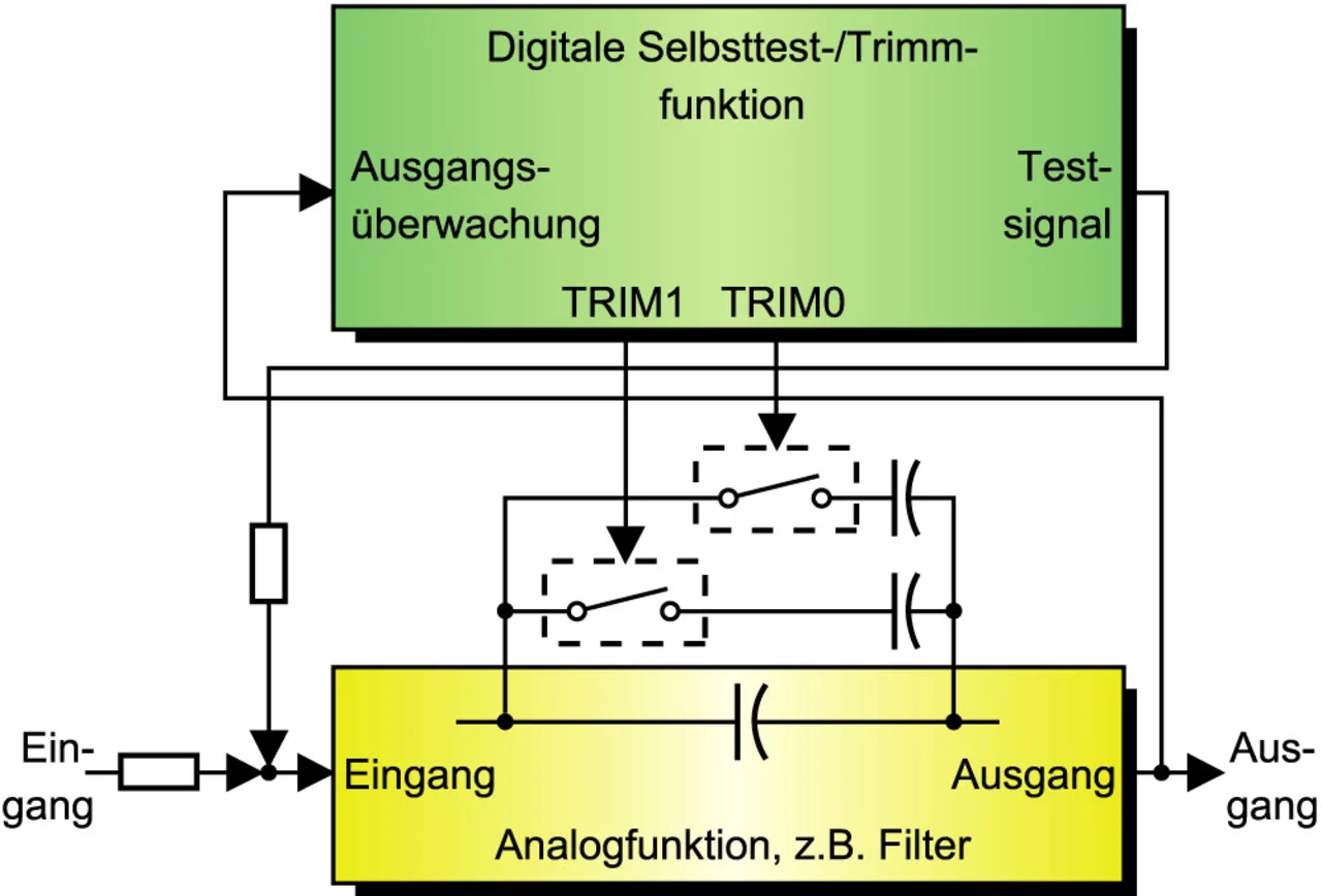 Eine aktive Steuerung kann auch zur Erzeugung von Testzuständen und -signalen für BIST-Modi (Built-In Self Test) verwendet werden. Durch Beobachtung der hervorgerufenen Effekte an inneren Knoten und an den Ausgängen ist es dem Embedded-Controller möglich, verschiedene Betriebszustände zu simulieren und die Funktionstüchtigkeit der Analogschaltung zu verifizieren.