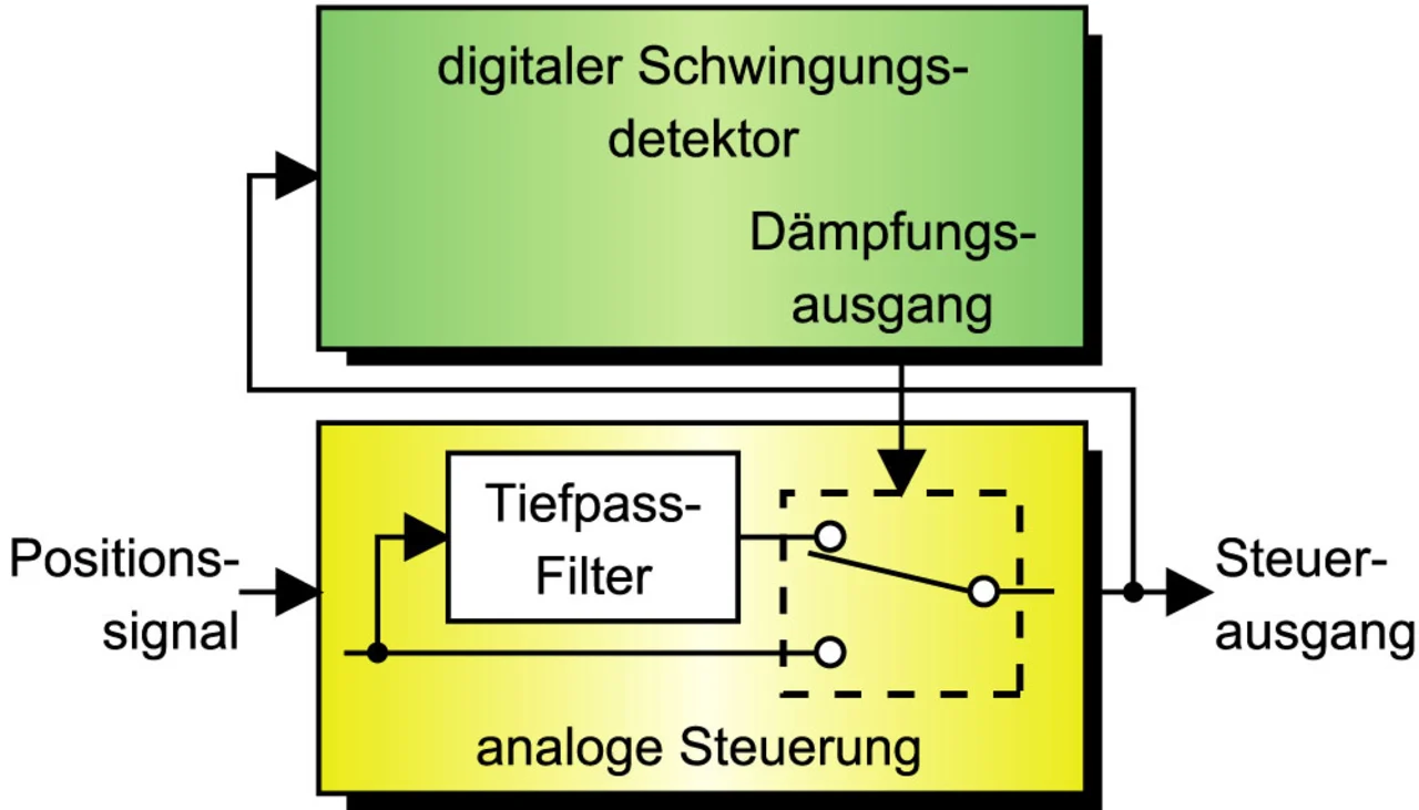 In Bild 5 ist das Grundkonzept dargestellt. Eine reale Implementierung würde höchstwahrscheinlich einen verzerrungsfreien Übergang zwischen den gefilterten und den ungefilterten Modi erfordern, zum Beispiel durch Verwendung des digitalen Signals zur Änderung der Filter-Zeitkonstante von einem unwirksamen in einen zur Schwingungsunterdrückung brauchbaren Wert.