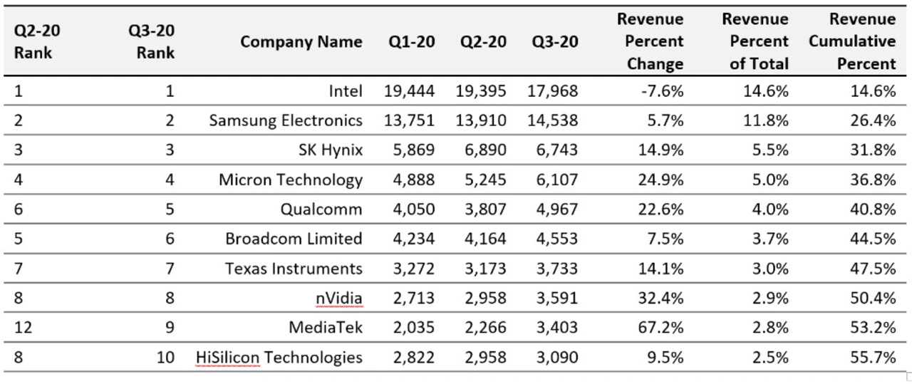Die meisten der zehn größten Halbleiterunternehmen von 2019 sind auch in diesem Jahr wieder im Ranking zu finden. Die ersten vier Plätze blieben gegenüber dem vorherigen Quartal unverändert. Qualcomm stieg dank der starken Nachfrage in der drahtlosen Kommunikation vom sechsten auf den fünften Platz auf. Auch MediaTek profitierte davon und stellt das einzige Unternehmen dar, das den Sprung in die Liste der Top Ten schaffte. Das Unternehmen stieg von Platz 12 auf Platz 9, da der Umsatz im Vergleich zum Vorquartal um mehr als 50 Prozent stieg. Hisilicon wiederum fiel in der Rangliste um zwei Plätze zurück. Der Umsatz von Hisilicon stieg zwar leicht, wird aber durch die Sanktionen gegen den Mutterkonzern Huawei negativ beeinflusst.
