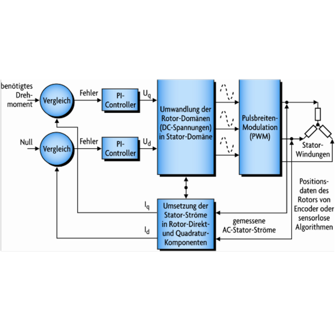 Bei hohen Drehzahlen hängt die genaue Berechnung des Stator-Stroms von der Bandbreite der PI-Funktion ab. Eine feldorientierte Regelung (FOC) oder Vektorregelung überwindet die Geschwindigkeitsbeschränkung einer sinusförmigen Regelung, indem die Motorströme und -spannungen in Bezug auf die direkten und 90° phasenverschobenen Achsen gehandhabt werden. Das Stator-Feld muss dabei konstant bleiben und 90° phasenverschoben zum Rotor-Feld sein - ungeachtet jeglicher Bandbreitenbeschränkungen des PI-Controllers.