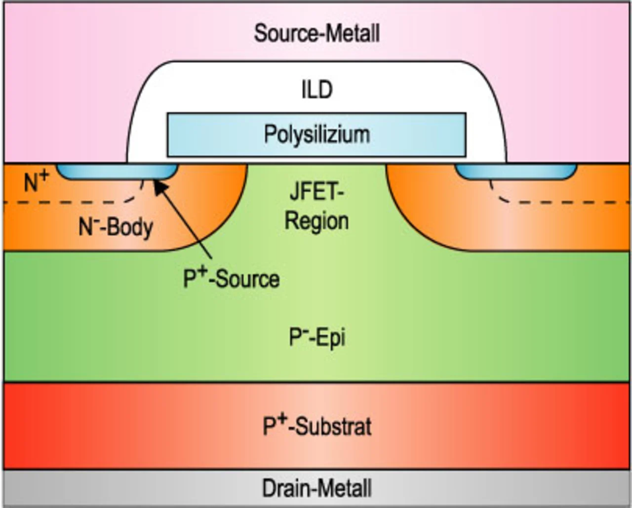 Leistungs-MOSFETs sind in der Regel vertikal ausgerichtete Bauelemente, deren Drain-Anschluss sich an der Unterseite befindet, während Source und Gate oben angeordnet sind. Die Herstellung erfolgt mit einem doppelten Diffusionsprozess. Als erstes wird die auch als Basis-Diffusion bezeichnete Body-Diffusion hergestellt, danach die Source-Diffusion. Um eine große Kanalbreite zu erzielen, werden Leistungs-MOSFETs als Parallelschaltung aus einer großen Zahl einzelner Zellen konstruiert. Während die Kanalbreite der einzelnen Zelle gering ist, ergibt sich durch das Parallelschalten von einigen Tausend oder Millionen Zellen eine sehr große Kanalbreite. Da der RDSon des MOSFET umgekehrt proportional zur Kanalbreite ist, während seine Stromtragfähigkeit in direktem Verhältnis zur Kanalbreite steht, erhält man auf diese Weise einen MOSFET mit niedrigem RDSon und großer Stromtragfähigkeit. Zwei entscheidende Design-Merkmale eines Leistungs-MOSFET sind deshalb Zellendichte (Anzahl der Zellen pro Flächeneinheit) und Kanaldichte (Kanalbreite pro Flächeneinheit).