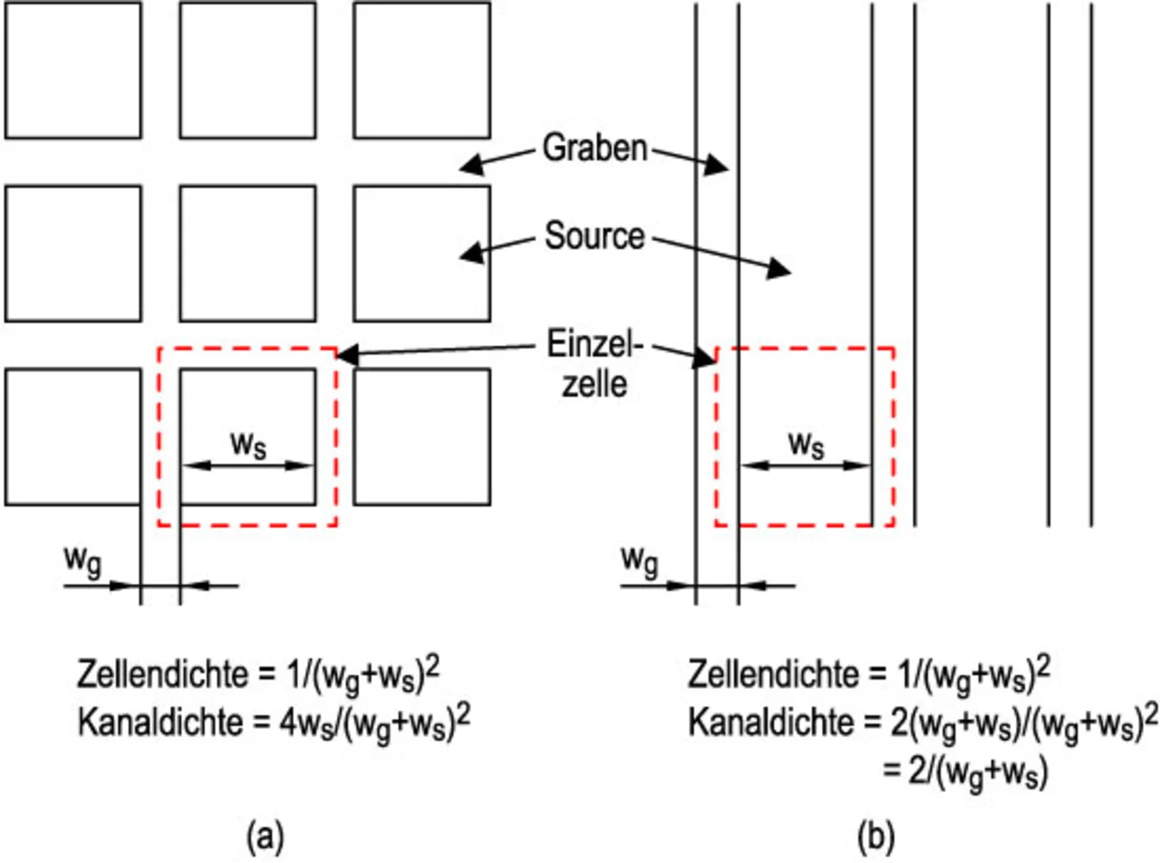Trench-Leistungs-MOSFETs können entweder mit einer geschlossenen Zelle oder mit einem Streifen-Layout entworfen werden. In einem Zellendesign bildet die Gate-Elektrode ein Gitter im Silizium, das eine Body- und eine Source-Region umschließt. In einem Streifendesign dagegen ist die Gate-Elektrode streifenförmig angelegt. Die heute auf dem Markt angebotenen Trench-MOSFETs weisen unterschiedliche Layouts mit quadratischen bzw. sechseckigen Zellen oder Streifen auf. Das gewählte Layout bestimmt die Kanaldichte und somit auch den RDSon des Trench-MOSFET. Bild 4 vergleicht die Kanaldichte eines Designs mit quadratischen Zellen mit der eines Streifen-Designs. Das minimale Zellenraster ist in beiden Fällen gleich. Man erkennt, dass das Zellen-Layout eine höhere Kanaldichte und folglich ein niedrigeres RDSon ergibt, solange die Breite des Poly-Gate (wg) kleiner ist als die Breite der Source-Region (ws).