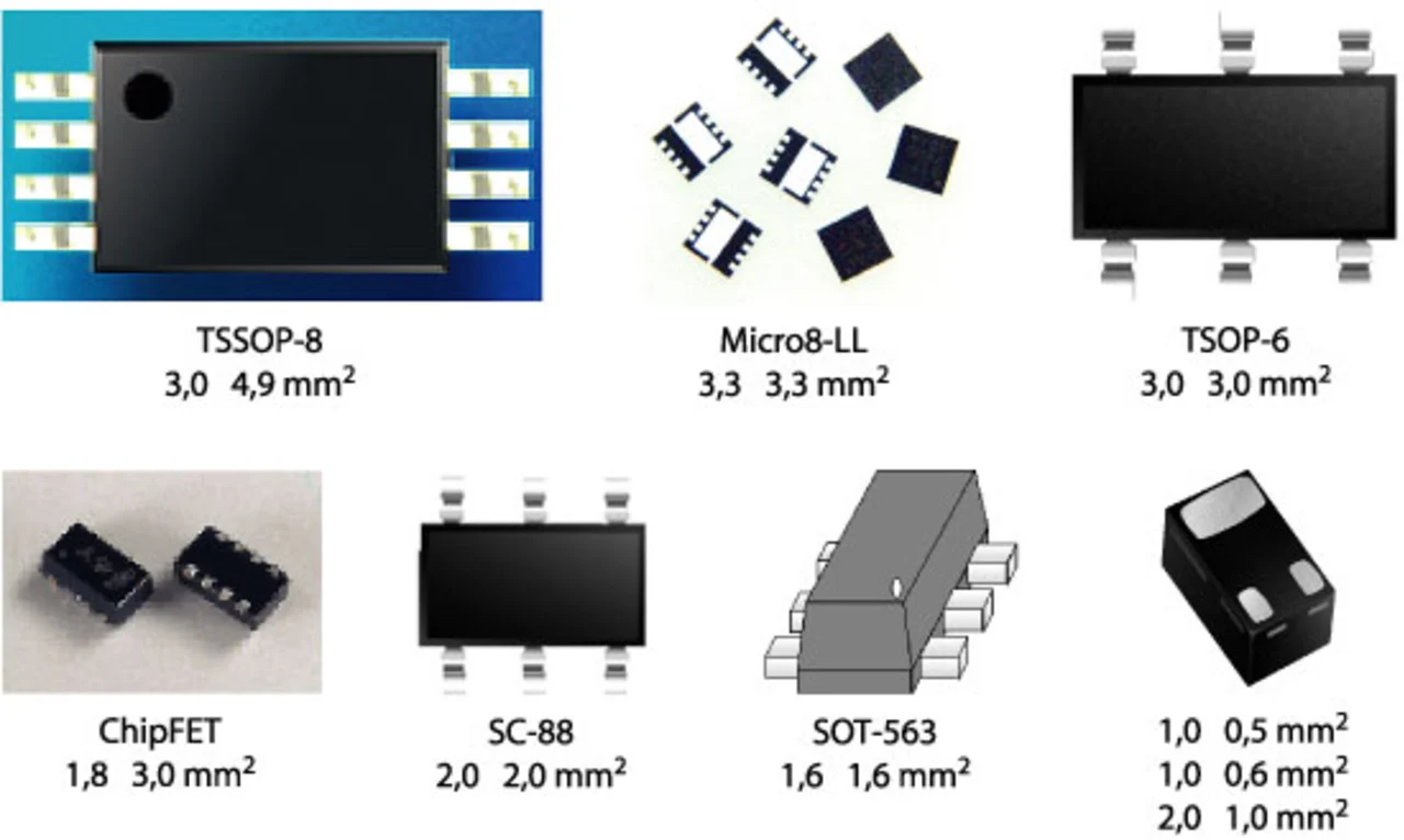 Trench-MOSFETs mit sehr geringen RDSon-Werten sind seit einigen Jahren beispielsweise im SO-8- oder TSSOP-8-Gehäuse auf dem Markt. Wegen der seit neuestem bestehenden Tendenz, für tragbare und drahtlose Geräte Bauelemente mit immer kleineren Gehäusen einzusetzen, werden diese relativ großen Gehäuse zunehmend durch kleinere Ausführungen wie TSOP-6, ChipFET (Vishay Siliconix) und SC-88 abgelöst. Bild 3 zeigt einige der verbreitet eingesetzten Gehäuse sowie Vorschläge für Gehäuse mit kleiner Montagefläche (Footprint) für tragbare und drahtlose Applikationen. Da in diesen kompakteren Gehäusebauarten nur kleinere Chips untergebracht werden können, ergeben sich zwangsläufig höhere RDSon-Werte. Gefragt ist deshalb eine Trench-Technologie mit niedrigeren RDSon-Werten. Von On Semiconductor wurde kürzlich eine neue P-Kanal-Trench-MOSFET-Technologie entwickelt, die für tragbare und funktechnische Applikationen konzipiert ist und bei gleichen Gehäusemaßen einen kleineren RDSon-Wert ergibt als die besten bisher auf dem Markt verfügbaren Technologien.