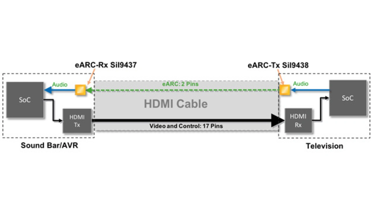 Über eARC stellen Sender-IC und Empfänger-IC eine Brücke her, mit der die S/PDIF- bzw. I2S-Audioschnittstellen in den jeweiligen Geräten verbunden werden – per differentiellem eARC-Signal und bis zur maximalen Datenrate von 98 Mbit/s.