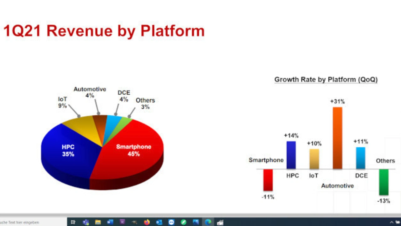Im ersten Quartal 2021 hat TSMC 4 Prozent des Umsatzes mit Automotive-ICs erwirtschaftet. Chips für den Einsatz in Smartphones kommen dagegen auf einen Anteil von 45 Prozent gefolgt von High Perfomance Computing mit 35 Prozent und IoT mit 9 Prozent. Allerdings ist der Anteil der Automotive Chips im ersten Quartal um 31 Prozent in die Höhe geschossen, gefolgt von HPC (14 Prozent). Der Anteil der Smartphone-Chips sank um 11 Prozent.