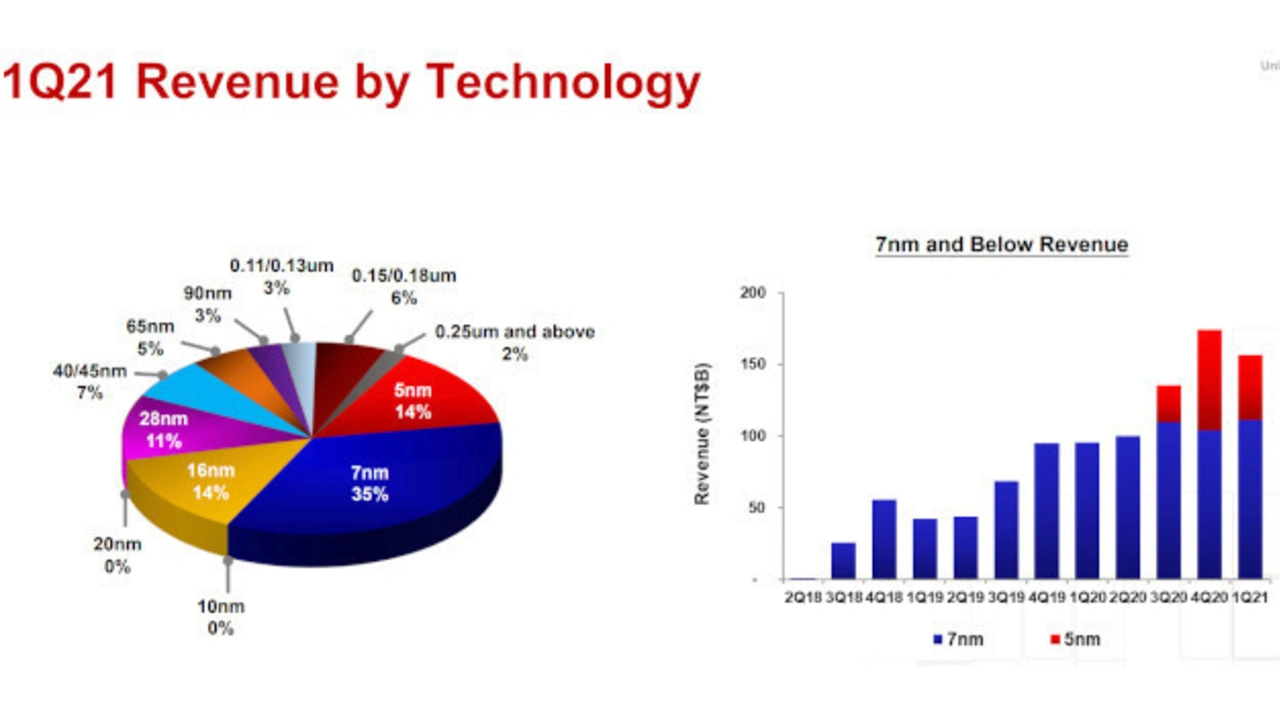 Der größte Umsatzanteil entfiel im ersten Quartal 2021 auf ICs, die mt Hilfe von 7-nm-rozessen gefertigt werden. Auf 5-nm-ICs entfällt bereits ein Anteil von 14 Prozent – genau so viel wie TSMC mit 16-nm-IC erwirtschaftet hat. Auf 28-nm-ICs entfallen 11 Prozent, gefolgt von 40/45 nm mit 7, 65 nm mit 5 und 90 nm mit 3 Prozent. Auf die äteren 0,15/0,18-µm-ICs entfallen immerhin noch 6 Prozent und auf die 0,11/0,13-µm-Prozesse 3 Prozent.