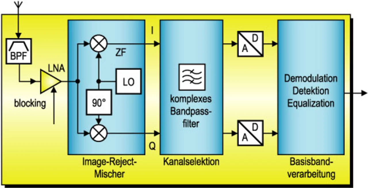 Das klassische Heterodynkonzept, das vor zehn Jahren in den Mobilfunkgeräten fast ausschließlich zum Einsatz kam, ist allerdings auf Grund der hohen Zwischenfrequenz für eine weitere Integration nur bedingt geeignet. Damit die großen Fortschritte der letzten Jahre erreicht werden konnten, mussten daher neue, besser integrierbare Architekturkonzepte entwickelt werden, die externe Komponenten wie teure und große Oberflächenwellenfilter vermeiden. Zu diesen innovativen Architekturen gehört insbesondere das Low-IF-Konzept, das auf der Umsetzung des HF-Signals auf eine sehr niedrige Zwischenfrequenz ZF basiert. Hierfür werden neben einem Image-Reject-Mischer komplexe analoge Filter benötigt.