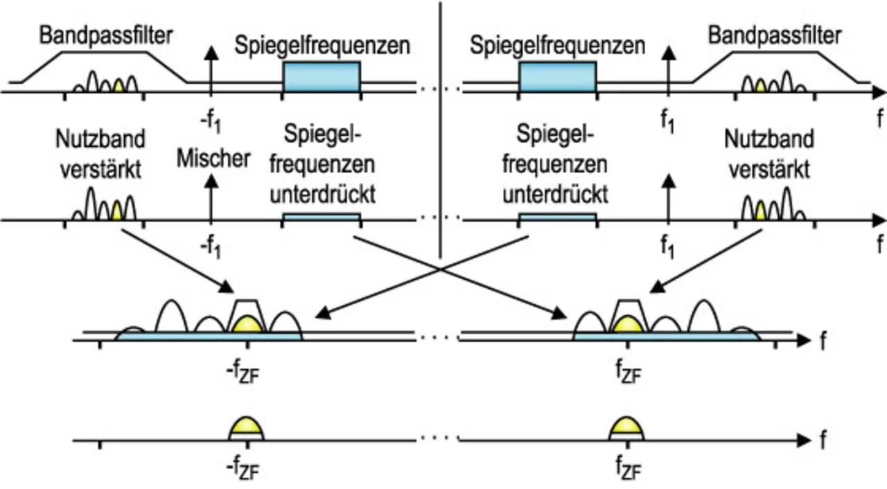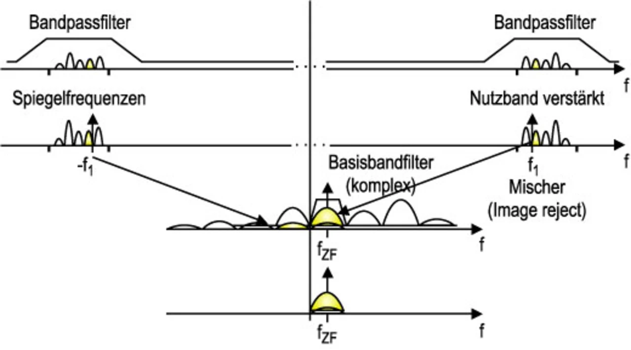 Wird eine höhere Zwischenfrequenz gewählt, was die Unterdrückung der Offset-Komponenten erleichtert, so steigen allerdings auch die Anforderungen an die Spiegelfrequenzunterdrückung. Kann die erforderliche Spiegelfrequenzunterdrückung durch den Image-Reject-Mischer nicht erfüllt werden, so bietet es sich an, vor den Mischer ein komplexes Bandpassfilter zu schalten, das die negativen Frequenzanteile und damit auch die Spiegelfrequenzen unterdrückt.