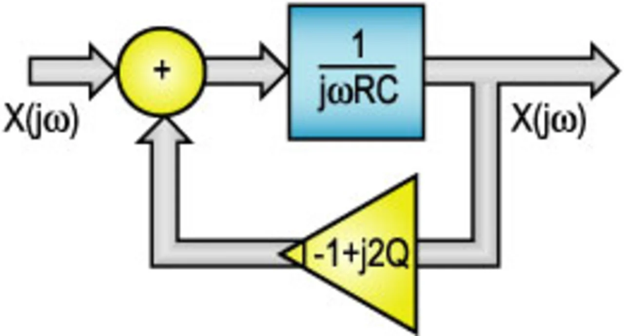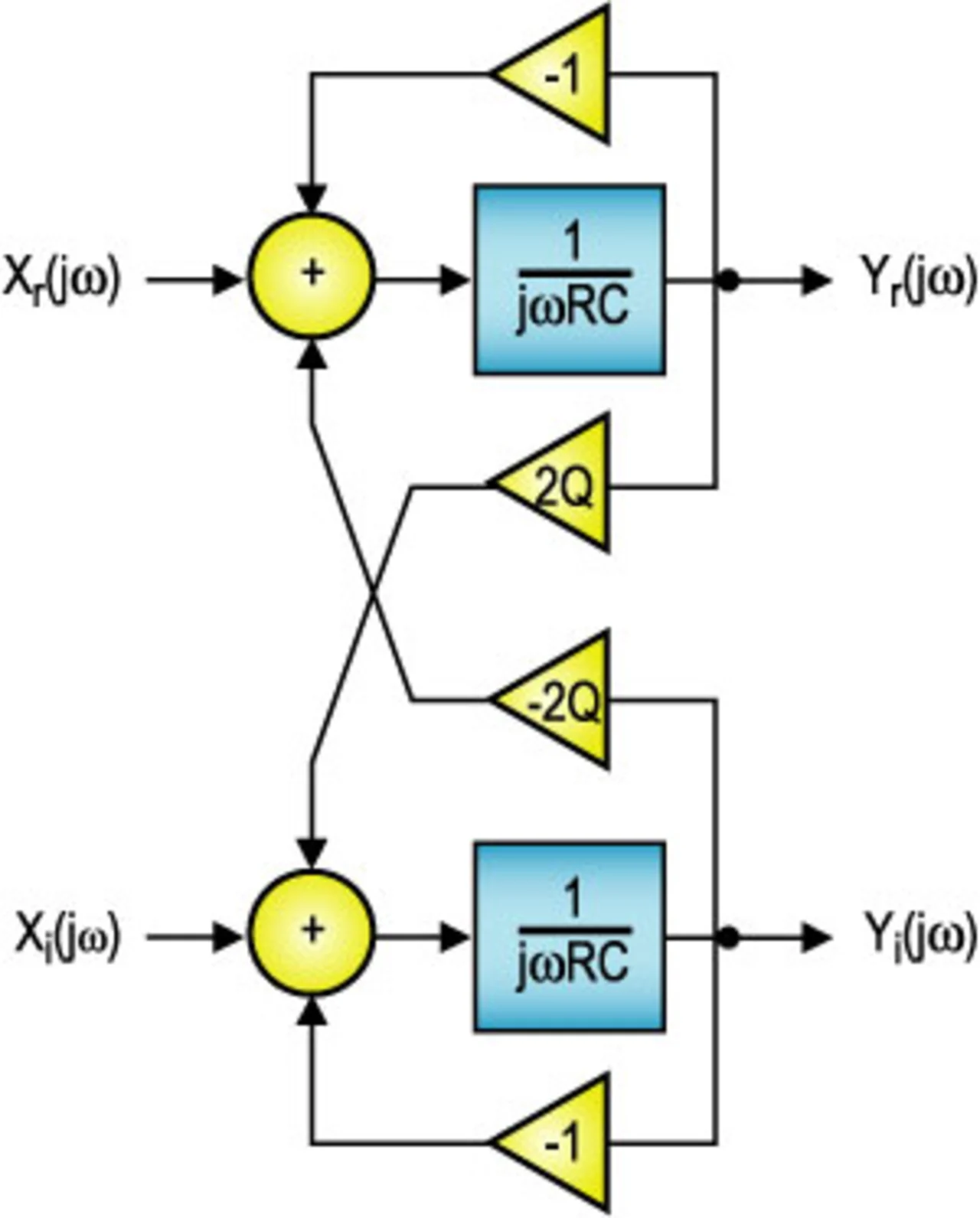 Mit Hilfe dieser Beziehung lässt sich das Filter direkt synthetisieren. Bild 6 zeigt das entsprechende Blockdiagramm mit den komplexen Größen, es wird lediglich ein Integrator und ein komplexer Verstärker benötigt. Die Realisierung mit reellen Signalen ist in Bild 7 zu sehen. Xr(jω) und Xi(jω) repräsentieren den Real- und Imaginärteil des Eingangssignals, während Yr(jω) und Yi(jω) die entsprechenden Komponenten des Ausgangssignals darstellen. Die Unterdrückung des unerwünschten Seitenbandes wird in erster Linie durch die Genauigkeit und die Matching-Eigenschaften der Filterkomponenten bestimmt.