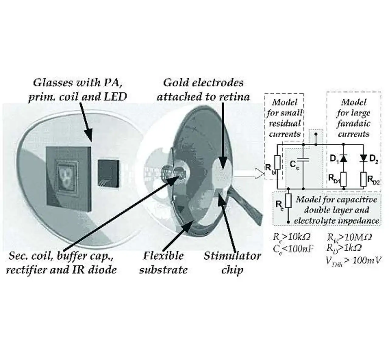 Im Prinzip funktioniert sie also wie ein Lichtempfänger in der Netzhaut. An der Spitze des Implantats befindet sich eine Art Zunge, auf der weitere 16 kleine Elektroden auf einer Fläche von 15 μm2 angebracht sind.