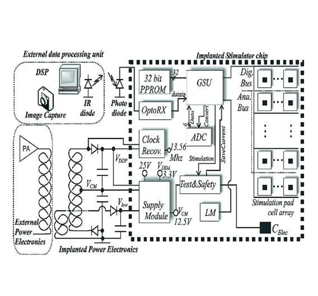 Hinzu kommen Forschungsschwerpunkte in den benötigten Hilfsschaltungen, unter anderem zur drahtlosen Energieübertragung sowie zur Kommunikation, also Systemkomponenten, die zur vollständigen Implantation benötigt werden. Bei Implantaten kommt zumeist eine telemetrische Energieversorgung zum Einsatz.