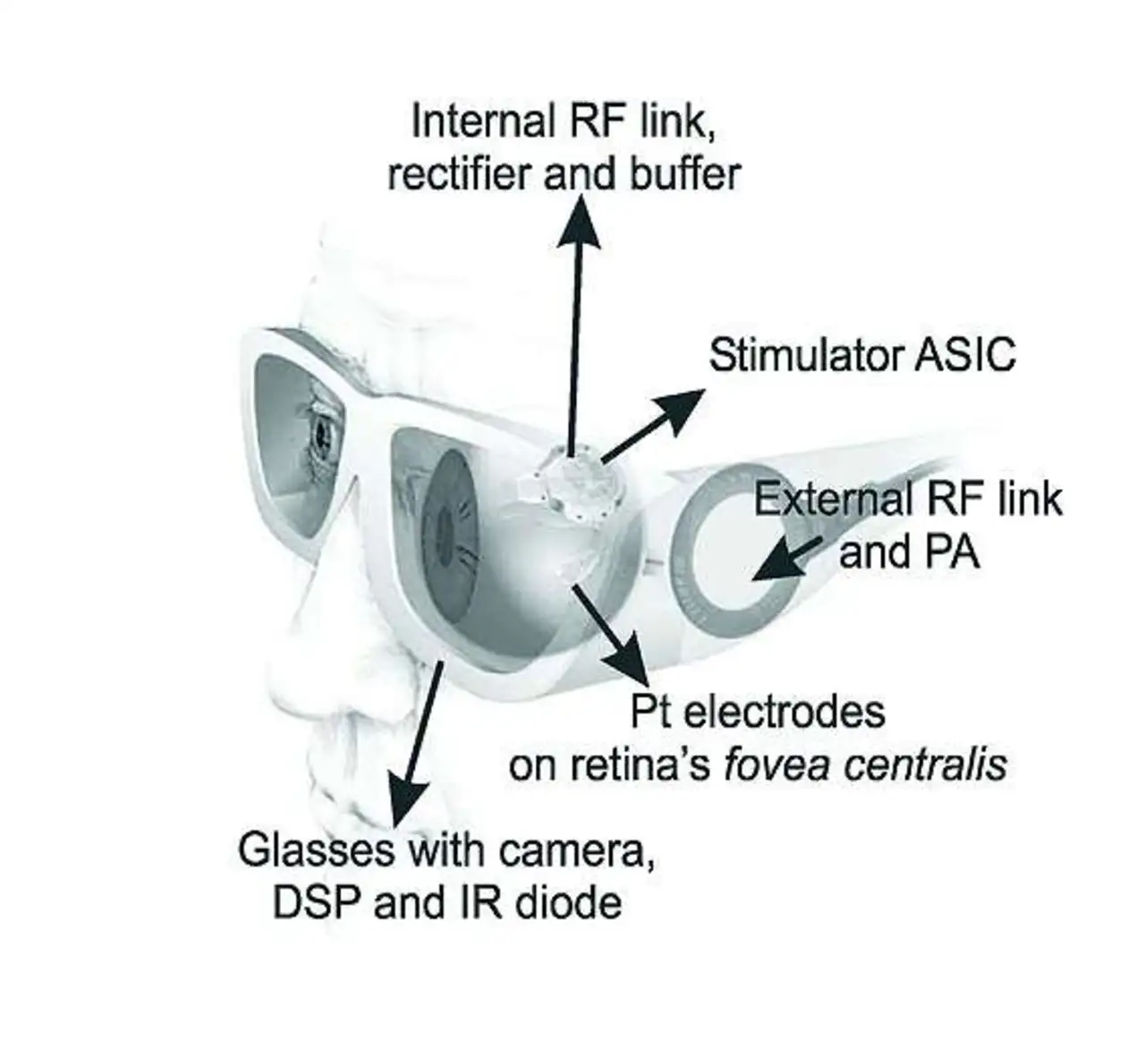 Ins Auge eingeführt, verläuft dieses Kabel unter der Kopfhaut die Schläfe entlang und endet in einem Stecker hinter dem Ohr.