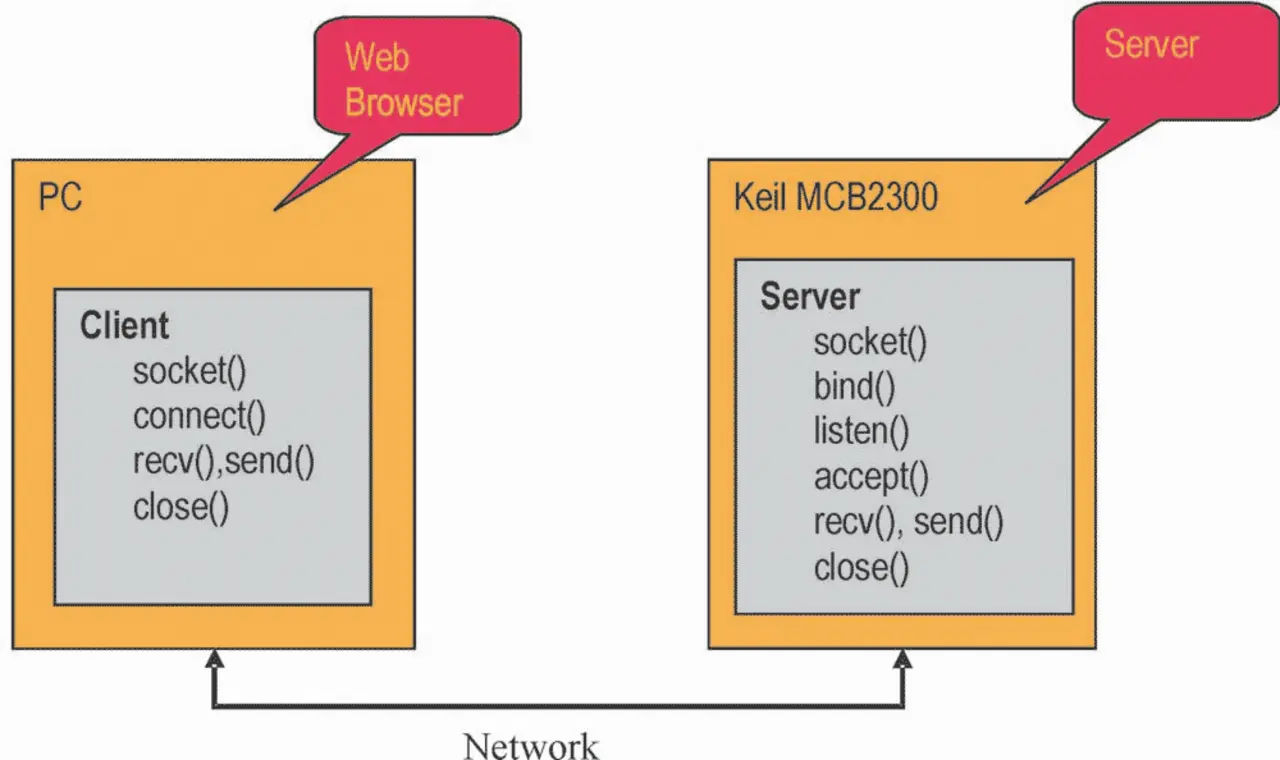 Diese Berkeley-Sockets-API stellt eine Sammlung von Unterprogrammen zur Verfügung, die eine Anwendung dazu benützen kann, mit anderen Computern über ein Netzwerk unter Nutzung des TCP/IP-Stacks zu kommunizieren. In Bild 3 ist eine vereinfachte Darstellung des BSD-API zu sehen. Das Diagramm zeigt beide Seiten einer Client-Server- Verbindung. Ein typischer zeitlicher Ablauf sieht wie folgt aus: