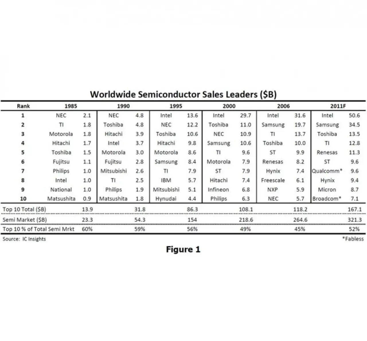 IC Insights hat eine Liste aufgestellt, in der die zehn größten Halbleiterunternehmen im Fünfjahresrhythmus seit 1985 aufgeführt sind. Drei Namen tauchen seit dieser Zeit immer auf: Intel, TI und Toshiba – auf den restlichen sieben Plätzen herrscht ein ständiger Wechsel.