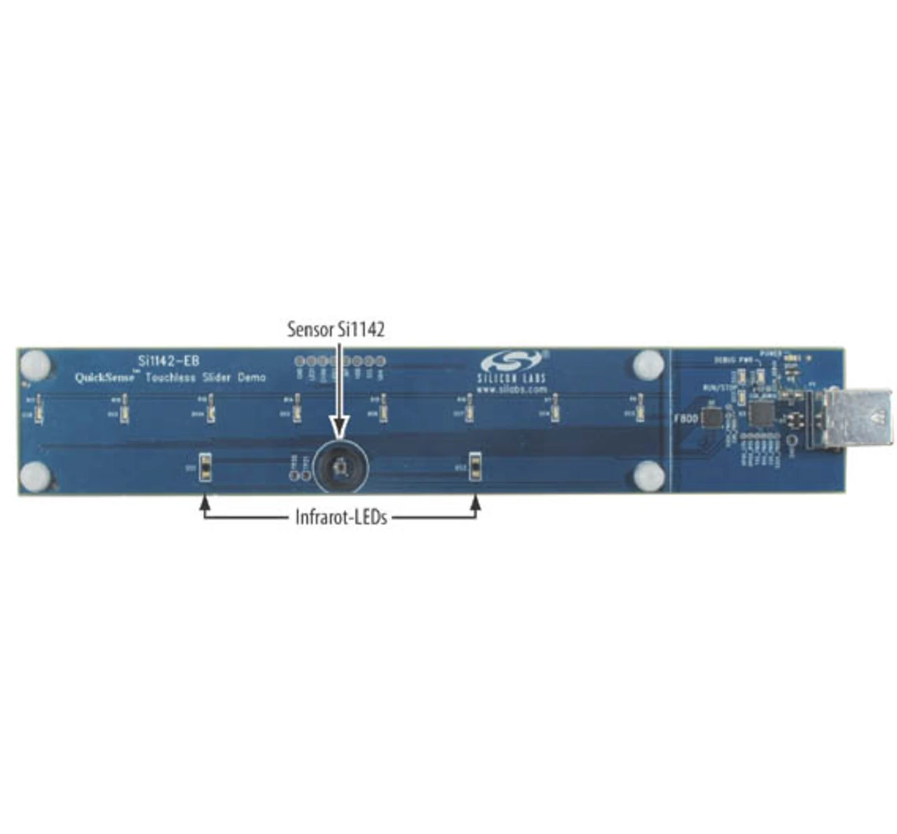 Das Evaluierungsboard IR-slider2EK (Bild 2) von Silicon Labs erkennt z.B. links- und rechtsläufige Gesten sowie Haltepunkte, wenn die Bewegung an einem bestimmten Ort gestoppt wird. Winkt ein Anwender seine Hand über das Board, wird hingegen weder der Haltepunkt noch eine Scroll-Bewegung erkannt. Jede dieser Aktionen kann somit mit einer Benutzeroberflächenfunktion in Verbindung gebracht werden.
