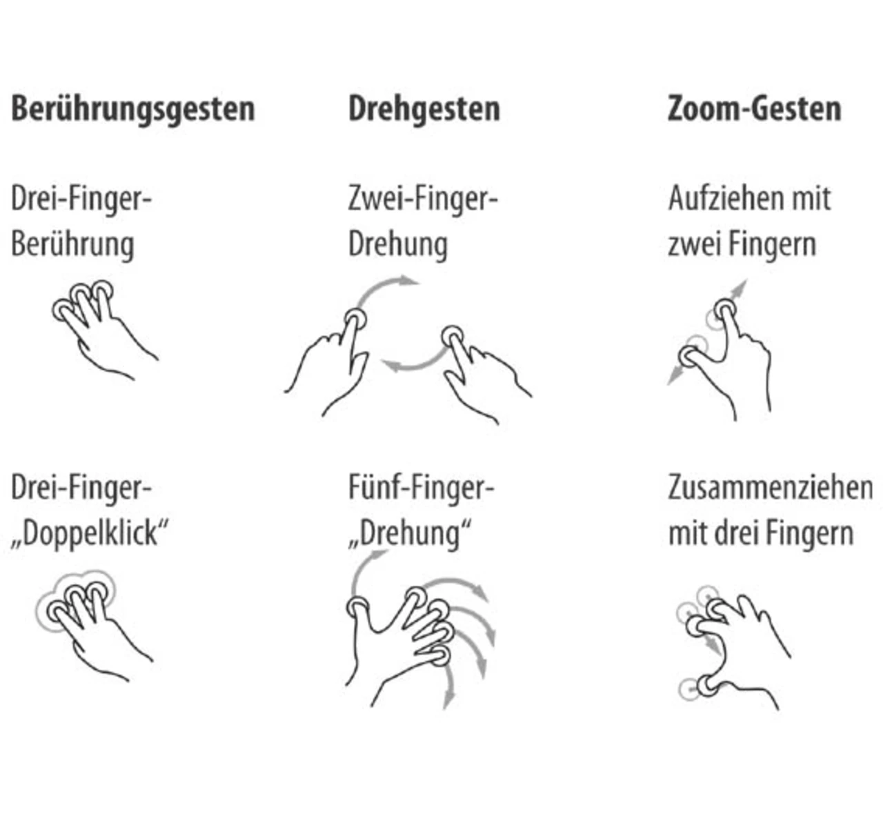 Berührungsgesten sind alltäglich geworden, da immer mehr Smartphones auf den Markt kommen. Multi-Touch-Gesten bzw. Gesten, die zwei oder mehr Finger erfordern, ermöglichen eine einfache Benutzung dieser zunehmend komplexer werdenden Geräte. Zu diesen Multi-Touch-Gesten zählen zahlreiche Eingabetechniken, wie Tippen, Wischen, Bewegen und Drehen (Bild 3).