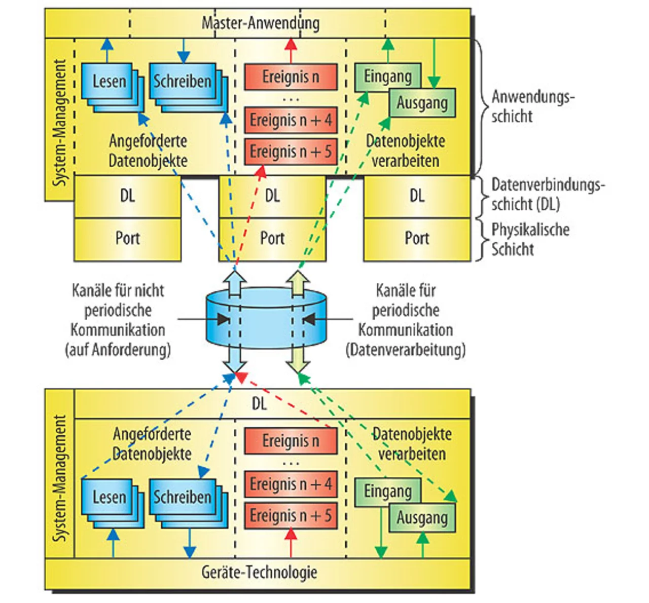 Auf der Anwendungsebene (Bild 2) unterscheidet IO-Link zwischen Prozessdaten, Parameterdaten (Read/Write-Objekte) und Ereignissen (Fehlern, Warnungen, Notifications). Prozessdaten werden üblicherweise zy-klisch übertragen. Parameterdaten und Ereignisse werden hingegen nur auf Anforderungen hin azyklisch übertragen. Diese Erweiterung der vormals ausschließlich vorhandenen Prozessdaten auf Diagnose- und Konfigurationsdaten ist eine der Schlüsselinnovationen von IO-Link zur Steigerung der GAE.