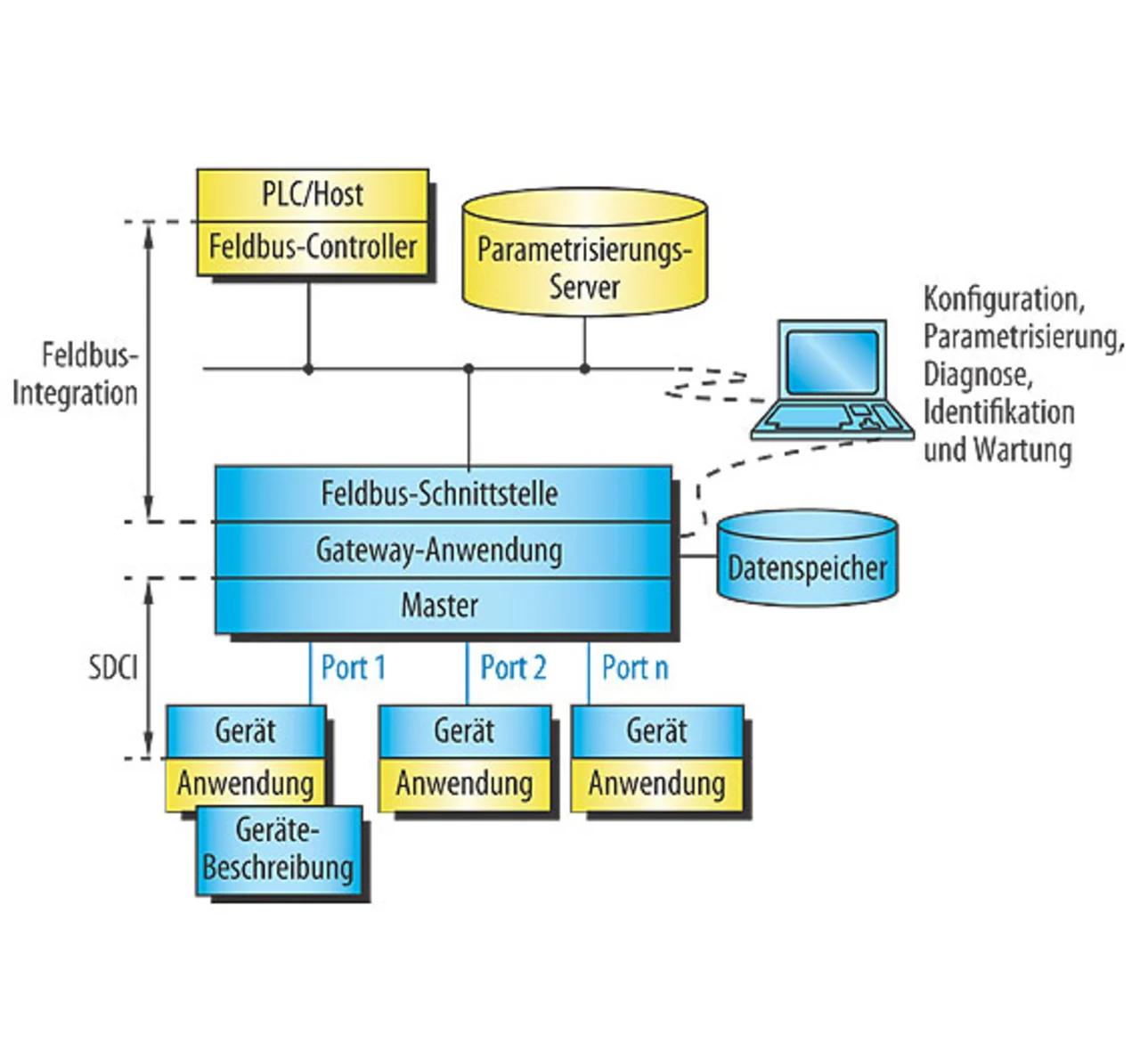 Somit können Parameterdaten direkt von der SPS-Ebene bis auf die Sensor-/Aktorebenen und Diagnosedaten umgekehrt mit Hilfe von IO-Link bis auf die SPS-Ebene kommuniziert werden. Diese Eigenschaften resultieren in einem Beitrag zur konsistenten Parameterverwaltung und entsprechenden Unterstützung bei der Wartung von verteilten Automatisierungssystemen.