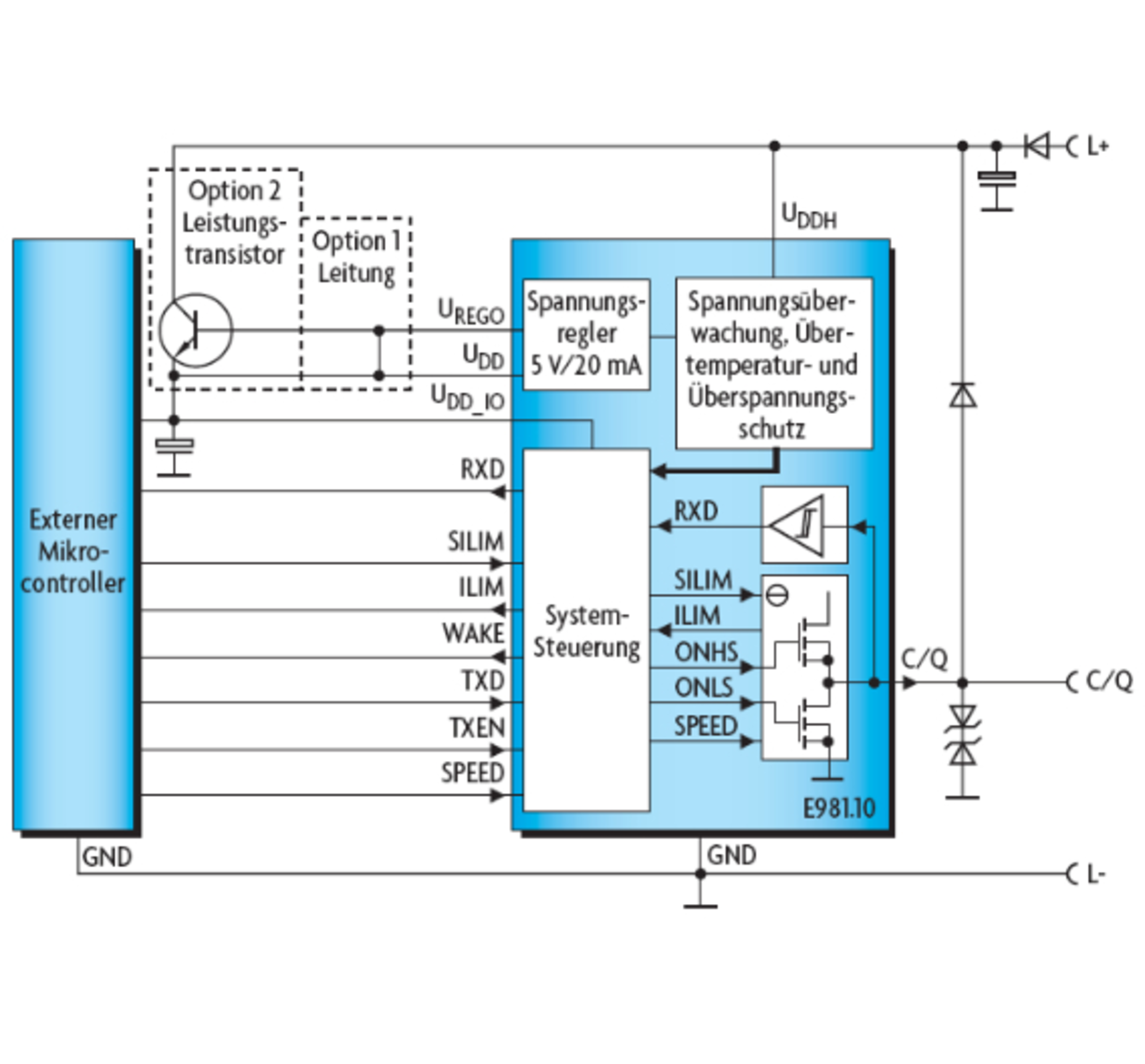 Dank eines internen 5-V-Spannungsreglers und eines 3,3-/5-V-kompatiblen Digital-Interfaces kann der E981.10 mit einer Vielzahl gängiger Mikrocontroller, z.B. mit einer 78KMCU von NEC Electronics Europe, die in diesem Fall die Protokollimplementierung übernimmt, kombiniert werden. Der bis zu einer Chip-Temperatur von +150 °C einsetzbare Baustein ist in einem nur 4 mm × 4 mm kleinen QFN Gehäuse untergebracht und damit für den Einsatz in kompakten Sensoren und Aktoren geeignet.