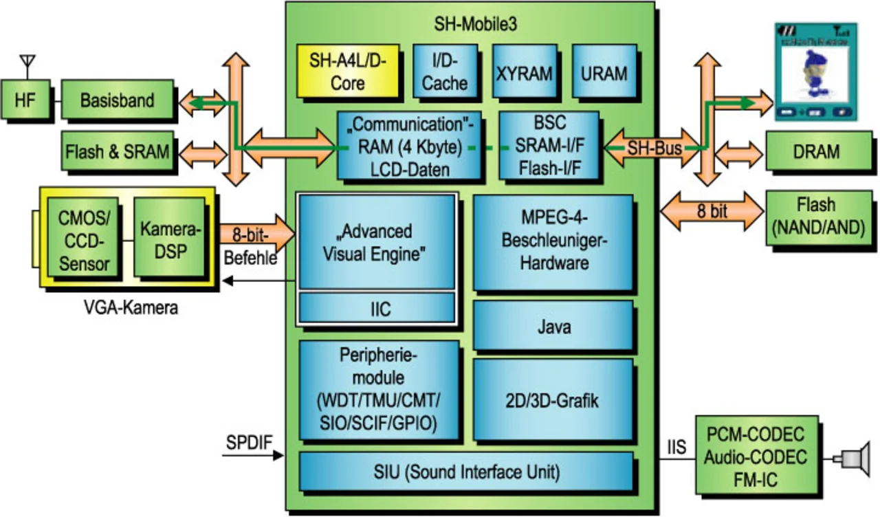Mit dem SH-Mobile3 für Mobiltelefone (Bild 3) und dem SH7770 (Bild 4) für Car-Information- und Multimedia-Systeme realisierte Renesas bereits mehrere auf diesem Baukastenprinzip basierende Chipsätze. Andere Bausteine wurden beispielsweise für Digitale Camcorder und verwandte Anwendungen entwickelt. Bisherige 2- oder 3-Chip-Lösungen konnte Renesas auf einen einzigen Prozessor-Chip integrieren. Berücksichtigt man noch die bisher benötigten Speicher-Chips, lassen sich effektiv bis zu sieben oder acht Bausteine in einem einzigen Gehäuse unterbringen.