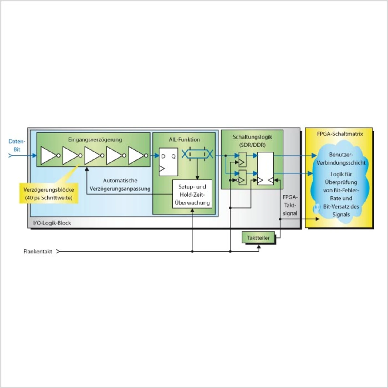Bei der dynamischen Verzögerung der Daten (Bild 2) kann jedes Datenelement unabhängig voneinander verzögert werden, damit die Daten sicher übernommen werden können. Hierbei lassen sich auch Laufzeit-Unterschiede ausgleichen, die durch unterschiedliches Verlegen der Leitungen auf der Leiterplatte entstehen. Diese Methode kann für Datenraten bis zu 2 Gbit/s verwendet werden. Um dies zu realisieren, benötigt jeder Dateneingang die Eingangsverzögerungen sowie die so genannte AIL-Funktion (Adaptive Input Logic). Sie sorgt dafür, das bei jeder Flanke die Verzögerungselemente nachgezogen werden.