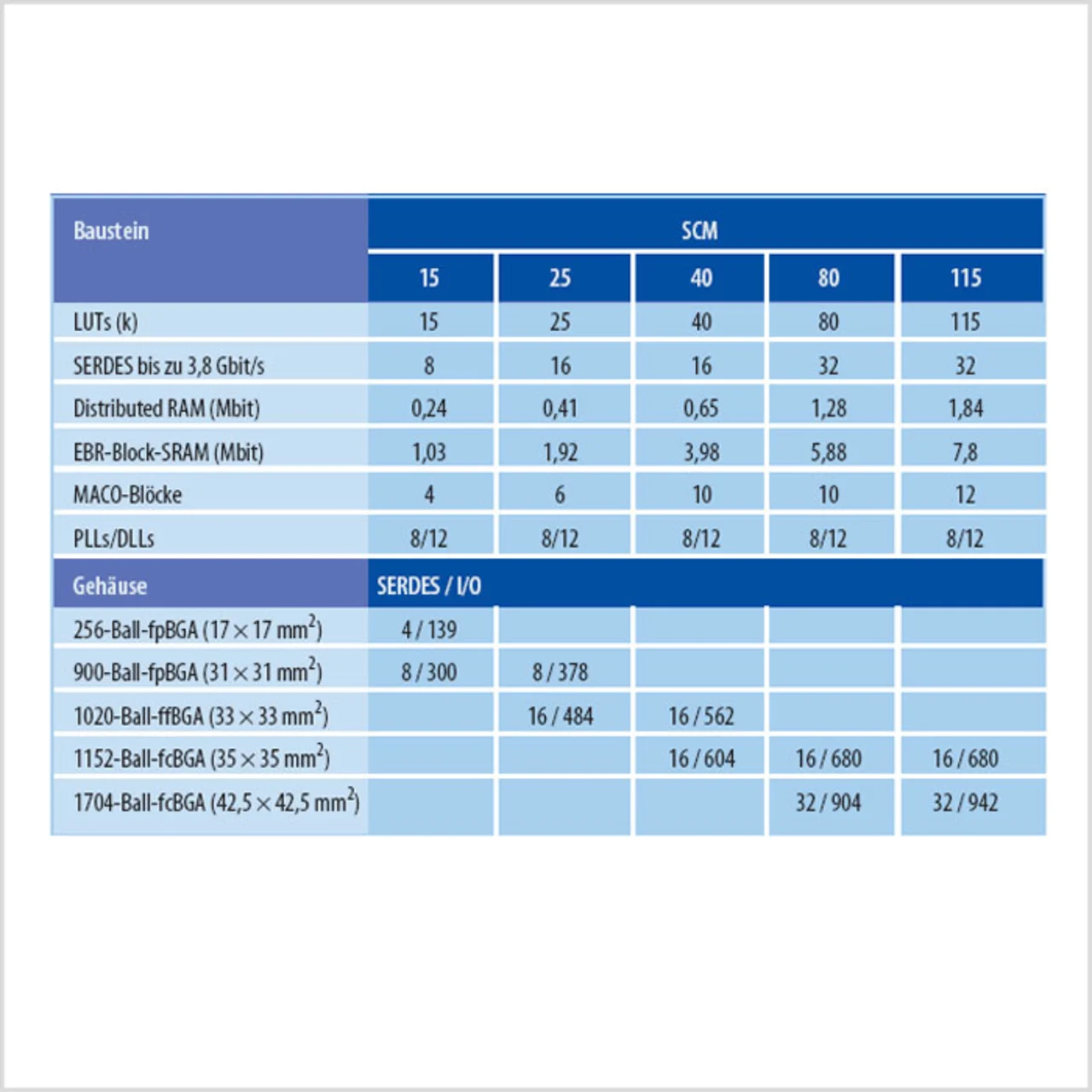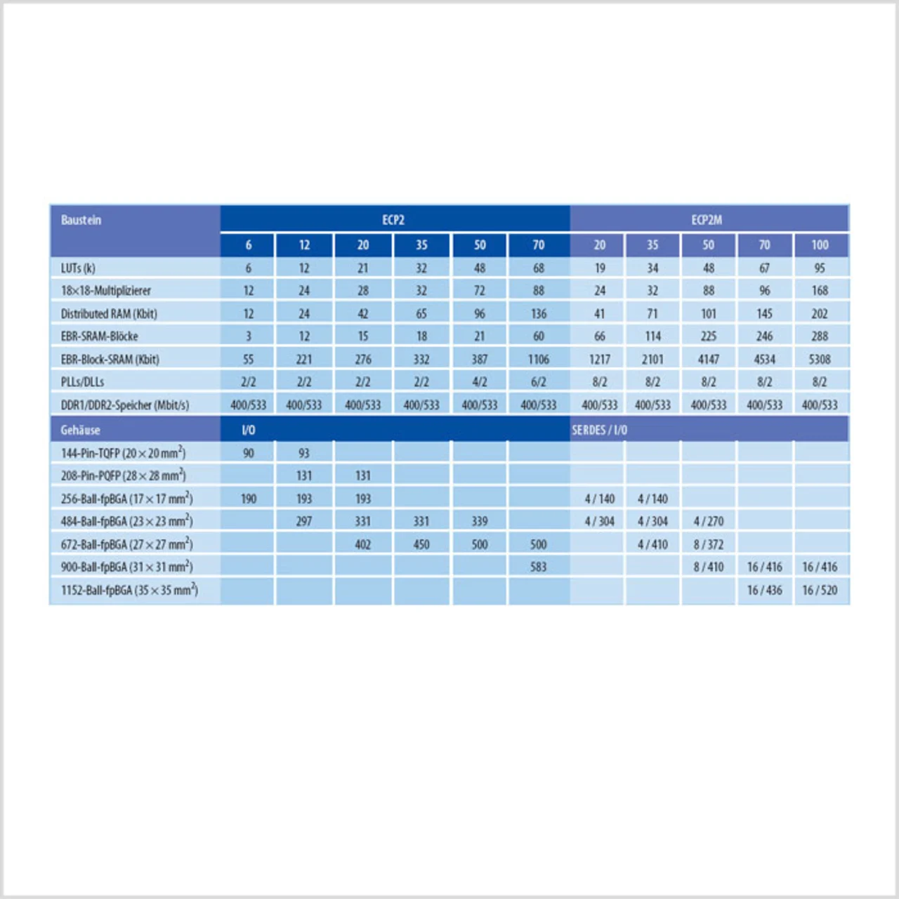 Für die Empfängerseite ist dies nicht ideal, da hierbei die Daten nicht direkt mit dem Takt übernommen werden können. Dazu muss der Takt verschoben werden, um die Setup&Hold-Zeiten zu erfüllen. Weiterhin ist bei parallelen Systemen ein gewisser Versatz (Skew) zwischen den Datenleitungen zu erwarten, der auf der Empfängerseite berücksichtigt werden muss. Dieser Datenversatz ist bedingt durch die etwas unterschiedliche Leitungsführung auf der Leiterplatte. Lattice hat zur Bedienung serieller oder paralleler Schnittstellen Low-Cost-ECP2/M-FPGAs und High-End-SCM-FPGAs im Programm. Einen kurzen Überblick über beide Familien geben Tabelle 1 und Tabelle 2.