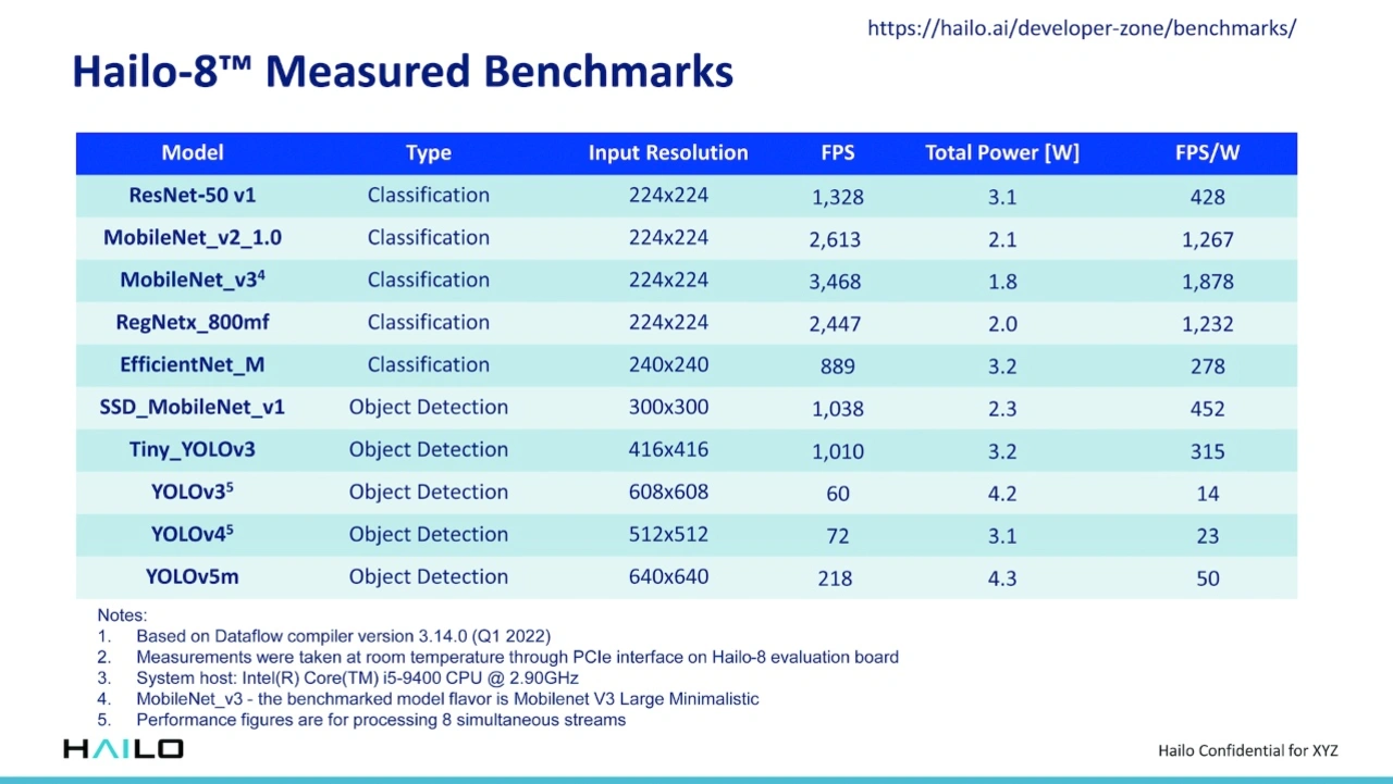 Auch wenn Hailo selbst mit 26 TOPS wirbt, weist Blacquière darauf hin, dass die von den Herstellern angegebenen TOPS-Zahlen (= 2 × MACS × Frequenz) für die Rechenleistung oft nicht allein entscheidend sind. Denn in den meisten Fällen könnten gar nicht alle TOPS genutzt werden; wie gut die Ausnutzung ausfällt, hängt einerseits von der Hardware-Architektur für die KI-Beschleunigung ab und andererseits vom eigentlichen neuronalen Netz, das mit dieser Hardware verarbeitet werden soll. Und hier sei Hailo oft im Vorteil gegenüber anderen Komponenten. Es gibt laut Blacquière diverse Beispiele, bei denen Hailo zwar weniger TOPS als konkurrierende Bausteine ins Rennen schickt, aber dennoch höhere fps (Frames per Second) bei dedizierten Netzen erreicht. So könne der Hailo-8 bei ResNet-50 laut eigenen Untersuchungen am meisten von den TOPS nutzen, die ihm zur Verfügung stehen.