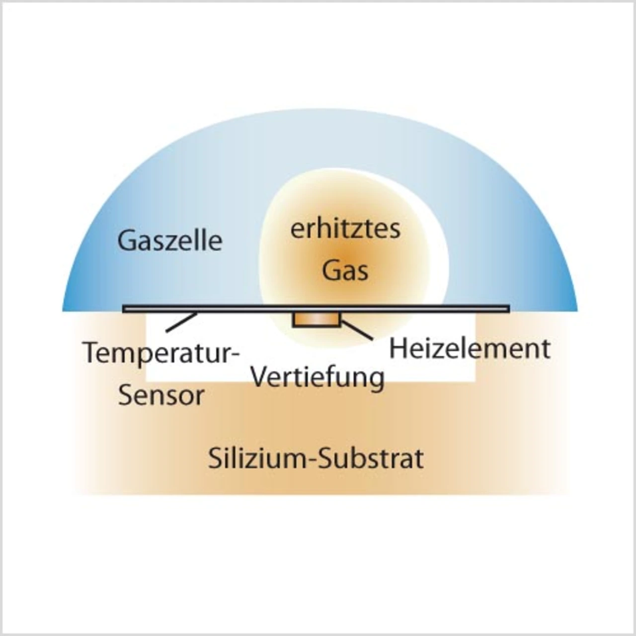 Der Sensor selbst besteht aus einer hermetisch geschlossenen Gaszelle, die über einem Silizium-Chip aufgebaut ist (Bild 1). In das Silizium, auf dem auch die erforderlichen Mixed-Signal-Schaltkreise integriert sind, ist eine Vertiefung geätzt, die mit einer „Membran“ überspannt ist. Diese trägt in der Mitte ein Heizelement, um das herum mehrere so genannter Thermosäulen (Thermo Piles) gleichmäßig gruppiert sind. Thermosäulen sind in Reihe geschaltete Thermoelemente, hier realisiert durch abwechselnde Schichten von Aluminium und polykristallinem Silizium. Die Ausgangsspannungen der Thermosäulen sind proportional zur Temperatur an ihrem Ort, mit der Anordnung wird also die Temperatur-Verteilung auf der Membran bestimmt.