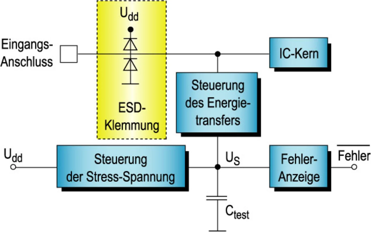 Um das Problem der Empfindlichkeit von Halbleiterstrukturen für EMV und ESD besser fassen zu können, wurden Modelle für die möglichen Einflüsse abgeleitet; hierzu gehören das „Human Body Model“ und das „Machine Model“ der IEC 60749. Die so festgelegten Testbedingungen werden zur Qualifikation der Produkte verwendet. Dadurch werden allerdings nur Extrembedingungen für die Qualifikation von Bauelementen festgelegt. Welchen tatsächlichen Einflüssen ein individuelles Bauelement während des Betriebs unterworfen sein wird, ist damit nicht bestimmt. Eine kontinuierliche Erfassung und Integration aller Umwelteinflüsse auf die Lebensdauer eines einzelnen Bauelementes war bisher nicht möglich. Eine speziell erweiterte „Sentinel Silicon“-Zelle erlaubt das Monitoring von ESD-Einflüssen auf das Halbleiterbauelement (Bild 5).