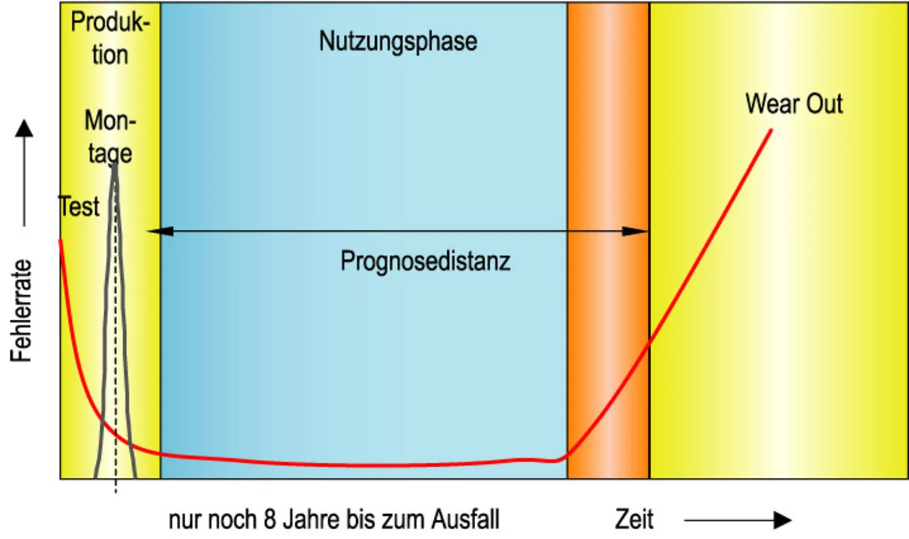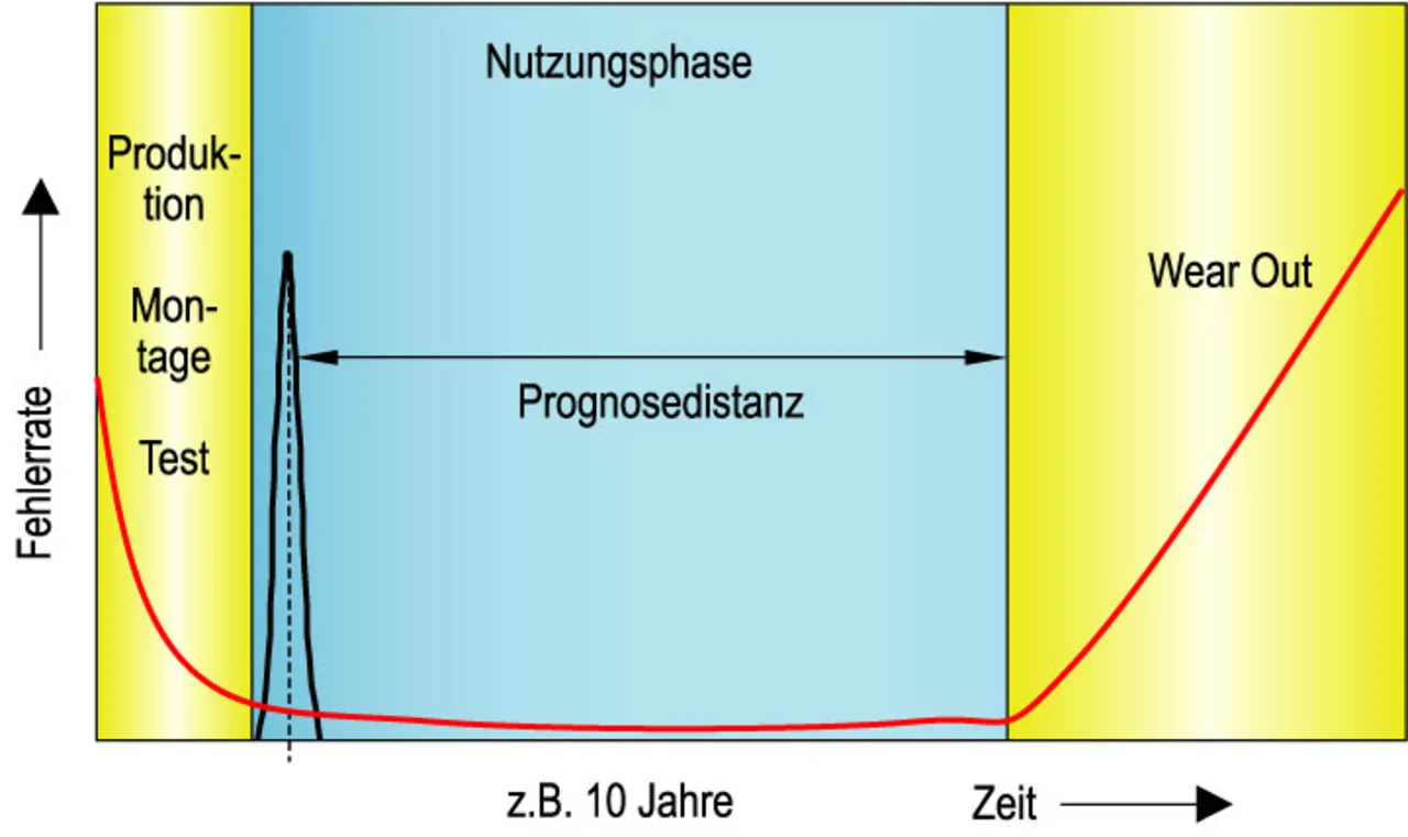 Wird die Prognose-Distanz in den Bereich der mindestens zu garantierenden Lebensdauer für ein Bauelement verschoben, dann ist dies ein wirksamer Monitor zur laufenden Kontrolle und Absicherung einer Mindestlebensdauer für jedes einzelne hergestellte Bauelement (s. Bild 3). Im Gegensatz zu den bisher hierfür eingesetzten Monitoren auf Halbleiterscheiben in der Produktion sind die „Sentinel Silicon“-Monitore in das Bauelement integriert und können zu jedem späteren Zeitpunkt ausgelesen werden, auch wenn eine direkte Kopplung mit der Halbleiterproduktion nicht mehr oder nur noch mit Aufwand herstellbar ist. Das hier vorgestellte Konzept des Monitorings kann insbesondere auch von den Herstellern in der Verwertungskette nach dem Halbleiterhersteller wirksam genutzt werden, z.B. von Systemherstellern, Herstellern ohne eigene Halbleiterproduktion (fabless) oder EMS (Electronic Manufacturing Services). Der Verlauf der Ausfallrate von Prognose-Zellen in Bauelementen, die einwandfrei hergestellt wurden und keine Beeinträchtigungen erfahren haben, ist in Bild 3 dargestellt. Diese Prognose-Zelle war zu allen Zeitpunkten in den Arbeitsschritten der Produktion einwandfrei und wird erst während des regulären Betriebs mit einem Vorlauf von 10 Jahren, wie in diesem Beispiel gewählt, ansprechen.