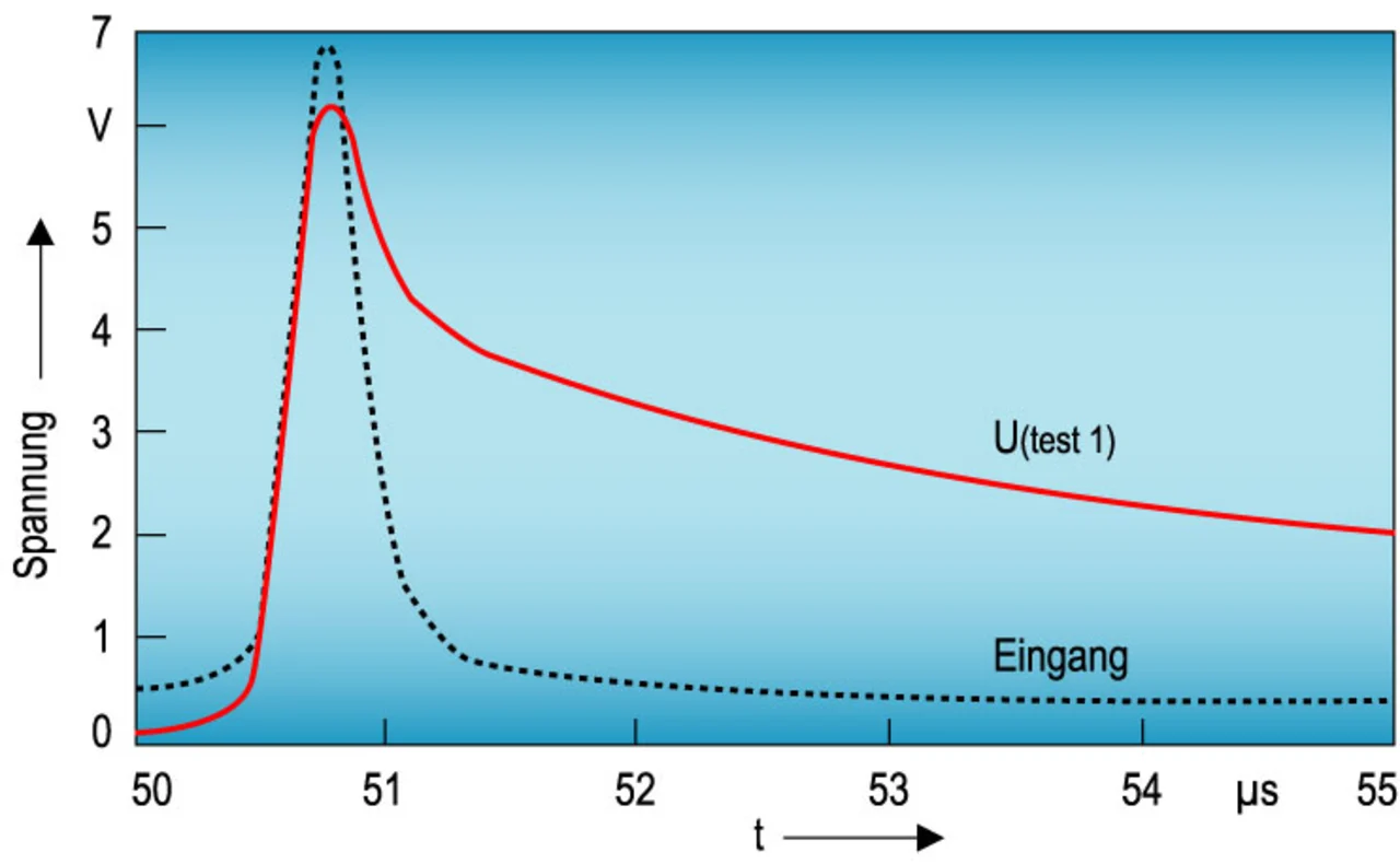 Die Funktion der Zellen ist unabhängig von der Stromversorgung des Bauelements und von der Polarität des ESD-Ereignisses. Bild 6 zeigt den Spannungsverlauf am Testkondensator Ctest. Diese Spannung belastet den Testkondensator und führt zu einer gezielten Alterung des Gate-Oxids. Die Spannung am Testkondensator ist proportional zur Stärke der ESD-Ereignisse. Im vorliegenden Beispiel (Bild 6) ist die Versorgungsspannung des Bauelements abgeschaltet, dennoch funktioniert die Schaltung, und der Testkondensator wird gezielt belastet.