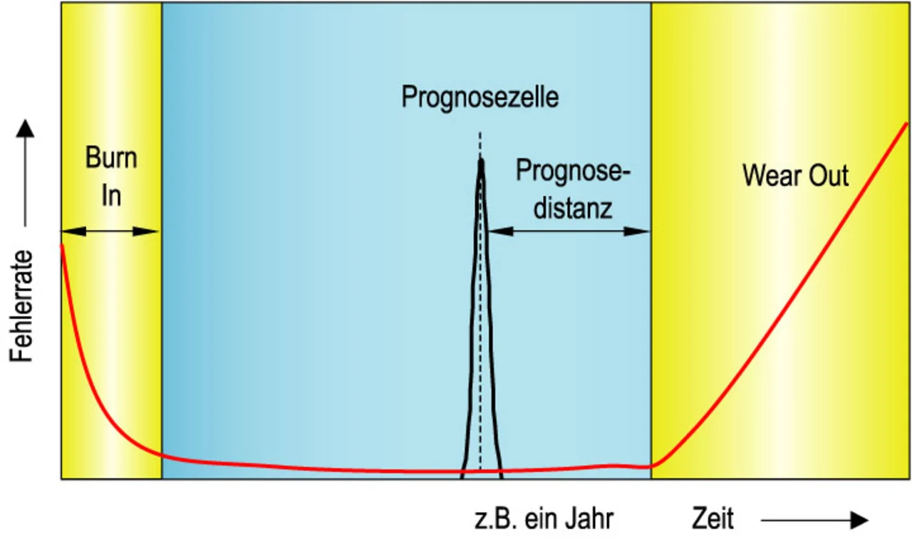 Wurde das Bauelement am Rande der Prozess-Toleranzen hergestellt, durch elektrische Interferenz beschädigt oder anderweitig belastet, ist die Lebensdauer reduziert. Bild 4 zeigt diesen Fall: Die Prognose-Zellen werden bereits während der Produktionsprozesse ausfallen. Der Status der Prognose-Zellen kann vor Auslieferung der fertiggestellten Bauelemente bzw. Module an den Endkunden im Endtest ausgewertet werden. Daraufhin können die gefährdeten Bauteile aussortiert werden. Gegenüber dem Endkunden kann eine garantierte Lebensdauer, bezogen auf das einzelne Modul, nachgewiesen werden.