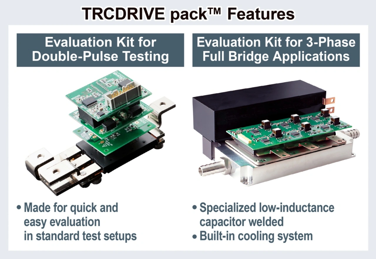 Rohm bietet umfangreiche Unterstützung auf Anwendungsebene, einschließlich der Nutzung des hauseigenen Motorprüf-Equipments. Darüber hinaus stellt das Unternehmen eine Vielzahl von Hilfsmaterialien zur Verfügung, zum Beispiel Simulationen und thermische Designs, die eine schnelle Bewertung und Einführung von TRCDRIVE-pack-Produkten ermöglichen. Es sind auch zwei Evaluierungskits erhältlich, eines für Doppelpulstests und das andere für 3-Phasen-Vollbrückenanwendungen, die eine Evaluierung unter ähnlichen Bedingungen wie bei Wechselrichterschaltungen ermöglichen (Bild 3).