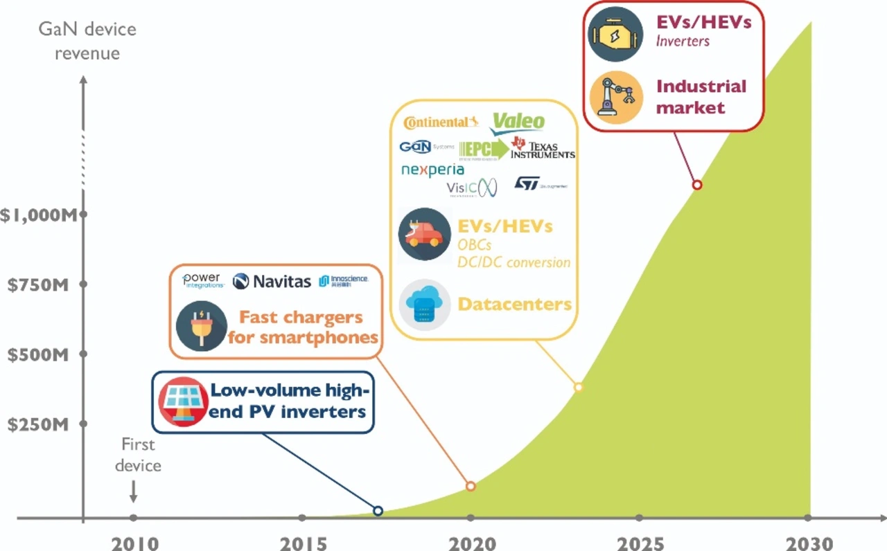 Auf lange Sicht kann Galliumnitrid in Fällen, in denen es seine Zuverlässigkeit und Leistungsfähigkeit bei hohen Strömen zu einem niedrigeren Preis nachgewiesen hat, in den anspruchsvolleren Markt für Wechselrichter für Elektroauto/HEV und den konservativen Industriemarkt vordringen. Dies könnte für Galliumnitrid beachtliche Möglichkeiten für hohe Stückzahlen schaffen. So arbeiten beispielsweise Nexperia und VisIC an GaN-Angeboten für xEV-Wechselrichter, um mit Siliziumkarbid und Silizium zu konkurrieren.